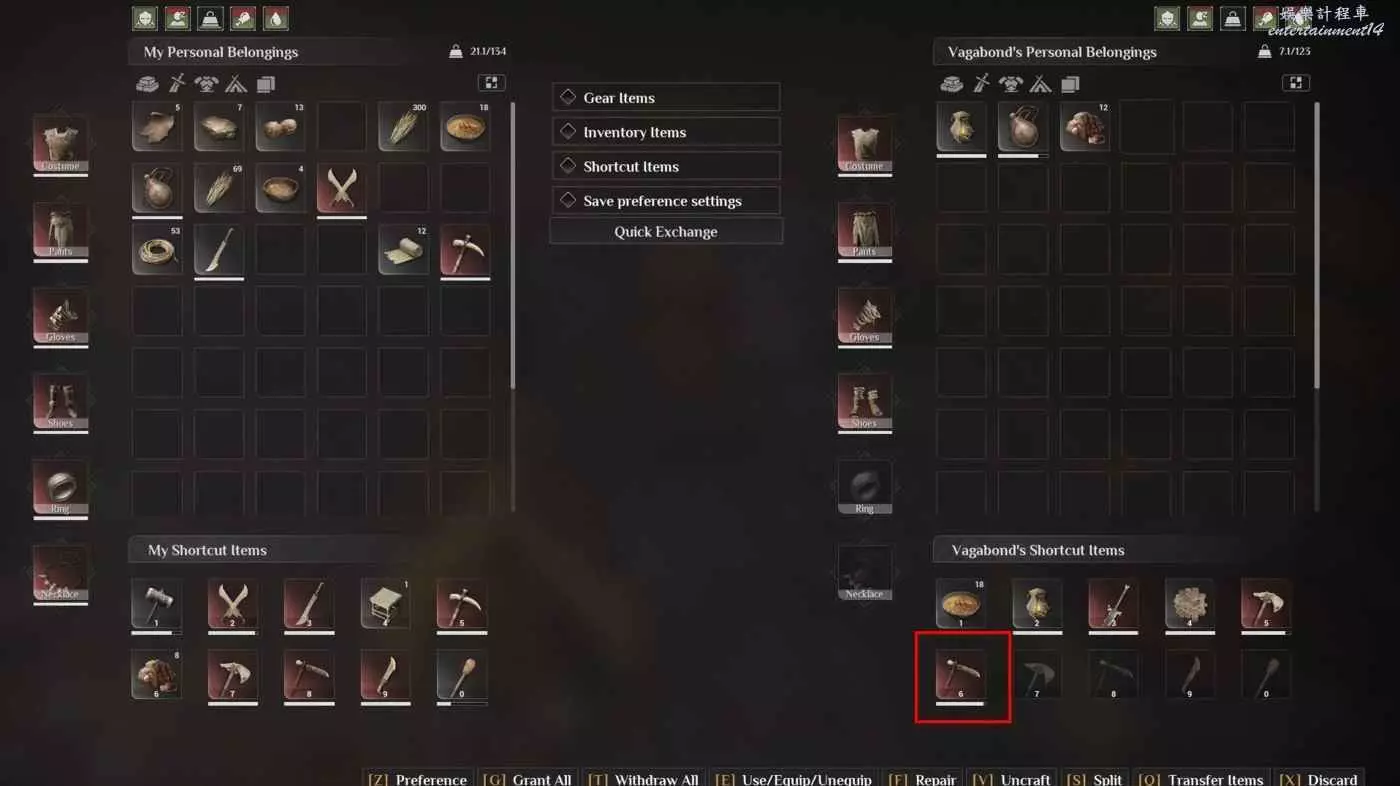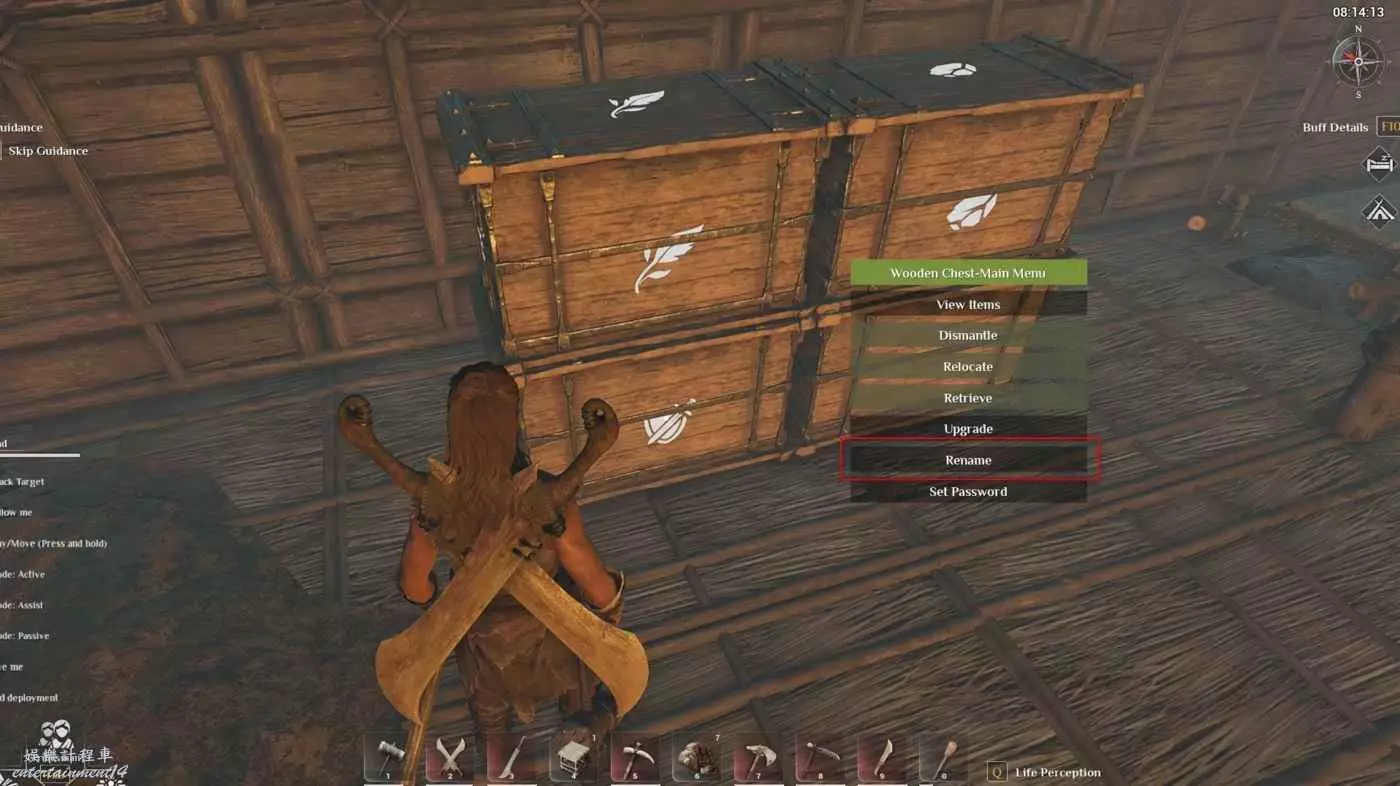 【E】:打開儲物箱/打開族人背包,對準儲物箱/族人長按可選擇更多選項