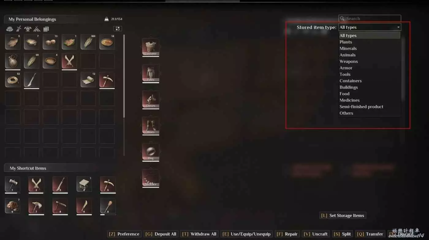 首先打開箱子的介面,隨後按【L】,就可以為該儲物箱設置可存放的物資的類型,設置好類型以後,建議修改一下物資箱的名字,方便以後查找。此時,在儲物箱介面按【G】鍵,可以將背包中的同類物品都轉移到儲物箱中。