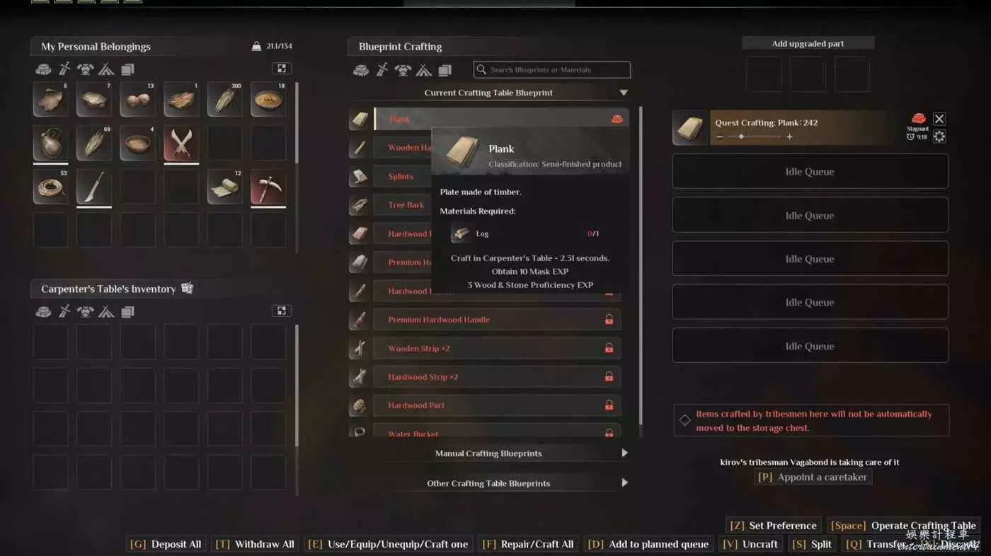 黃色的標記代表著該族人負責管理這個木匠桌。隨後,我們將游標移動到【木板】上,隨後按【D】鍵,即可設置一個物品製作任務,你可以隨意調節需要製作的數量,如圖,我設置了製作242個木板的任務。此時,只要你的儲物箱或者木匠桌中有製作【木板】的原材料【原木】,族人管理這個木匠桌的族人就會自動取儲物箱中拿取【原木】,隨後在木匠桌生產木板。