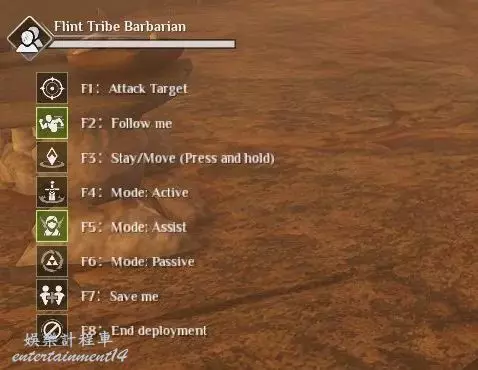 說完【控制】,我們再說一下【出戰】。對準族人長按【E】鍵呼出功能表,選擇【出戰】。族人出戰後,螢幕左下角有族人指令,可以快速鍵為F1-F8,可以知識出戰的族人跟隨您或者停留在原地。您還可以選擇戰鬥風格,要求族人主動攻擊附近的敵人或者進行防禦。【F7】鍵可以 要求族人在您被擊倒的時候優先救治您。
