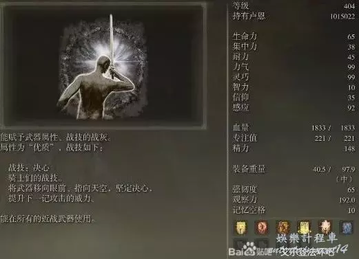 巨劍作為特大劍面板傷害很高。戰鬥之前把左右手兩把武器都上一下這個戰灰,就能夠在第一波攻擊時打出極高的爆發傷害。