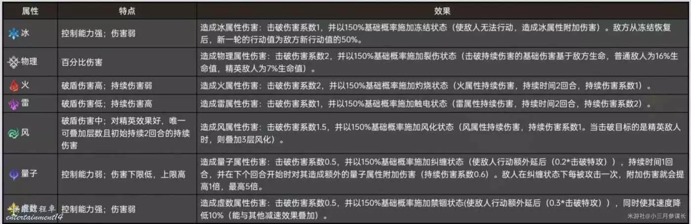 然後是不同之處:擊破觸發傷害和敵人的韌性上限有關,因此算是”傷害不詳,觸強則強”.超擊破傷害與本次攻擊造成的削韌傷害有關(即削韌值,比較看角色.而擊破持續傷害沒有和韌性相關的乘區。而且擊破觸發傷害與擊破持續傷害也和屬性有關,屬性傷害係數分為觸發係數(影響擊破觸發傷害)和dot係數(影響擊破持續傷害),而不同的屬性特點不同,詳細的資料可以參照下表