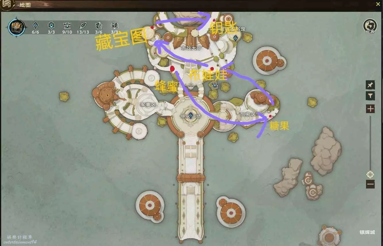 7、根據圖2位置自動尋找,找到對應npc換取物品即可獲得鑰匙:蜂蜜→糖→布娃娃→藏寶圖→鑰匙。最後換到鑰匙,根據指引就行