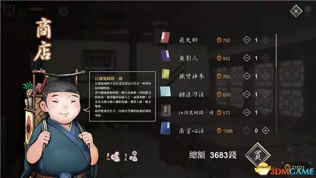 你可以在他的商店內買到很多武功秘籍,補藥以及可以討小師妹歡心的“色紙”。