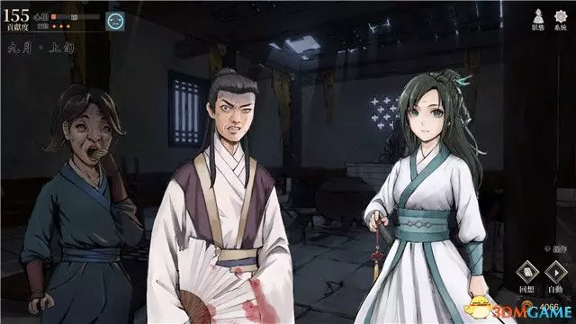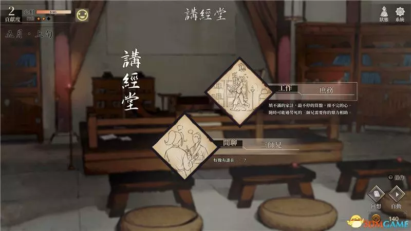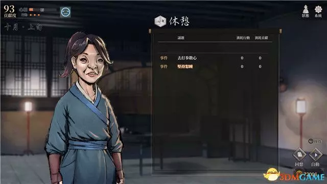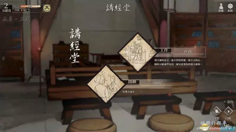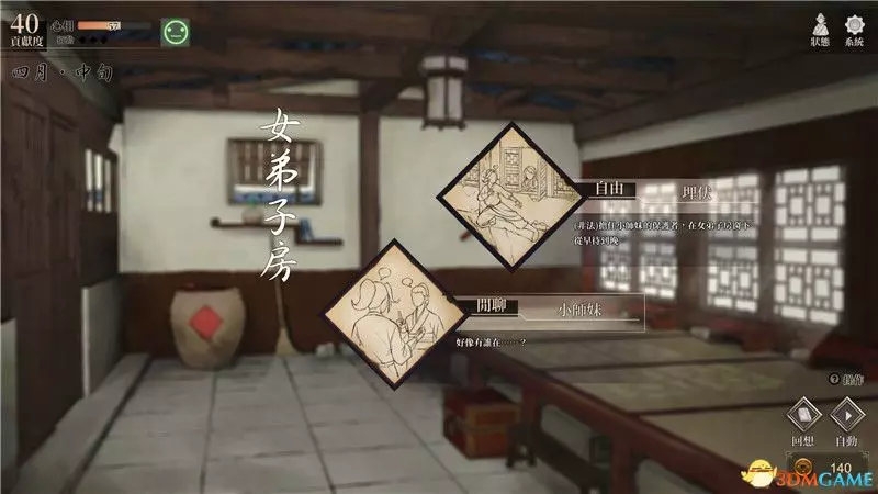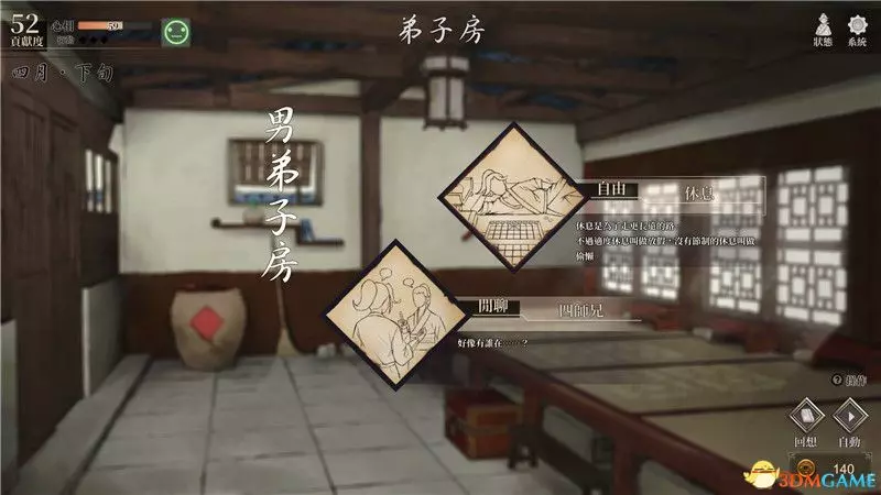 到達寺廟後將是夜晚,此時你有3個行動點,但實際上你只能前往男弟子房,完成一系列閒聊後睡覺到達第二天早上。