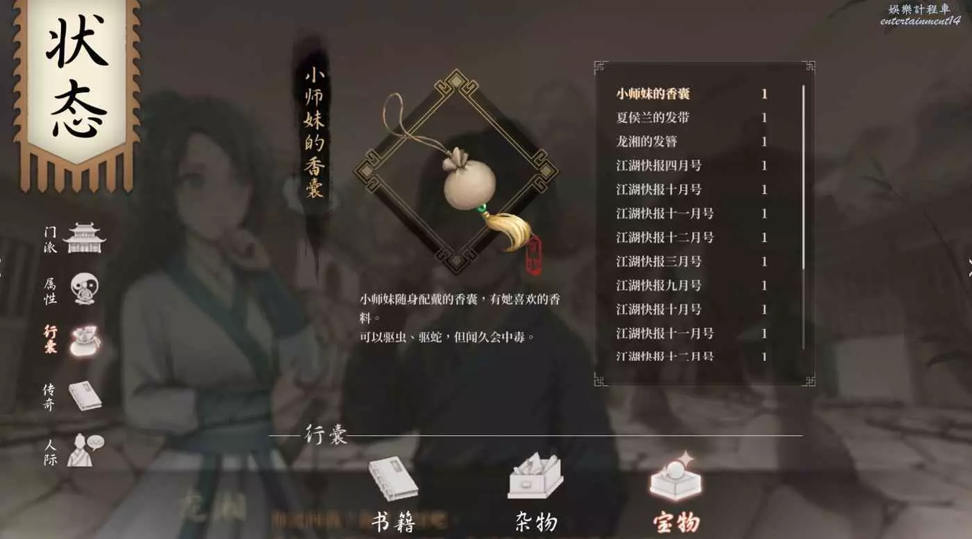 龍湘:初始好感度要4星吧,然後觸發去武林大會的時候會有夜談,知曉身世。後續還得在大會上保護龍湘,這樣會跟著你會唐門。觸發節點應該是第三年十月到一月前,一定要到後山搬柴刷出“讓她看看你的劍”三次,這樣就可以進線了,此時心上人得是龍湘。
