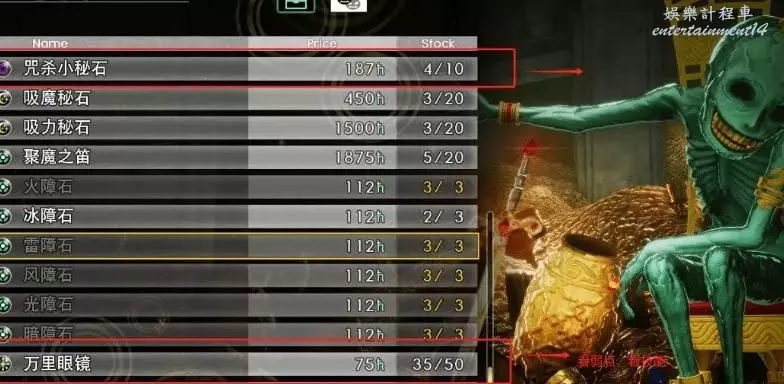 商店購買重要道具:萬里眼鏡,各類屬性攻擊石頭