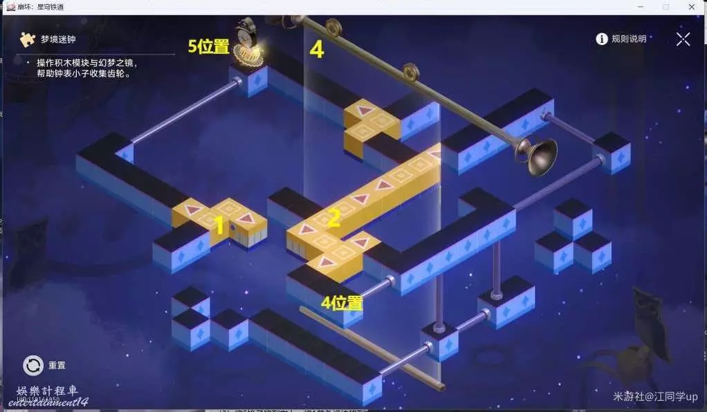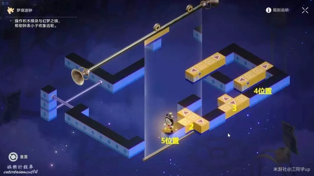 (4)將上圖4中,4鏡子移到左上,1黃色模組移到左上,2黃色模組移到右上,【鐘錶小子】會從4位置到5位置,解密完成