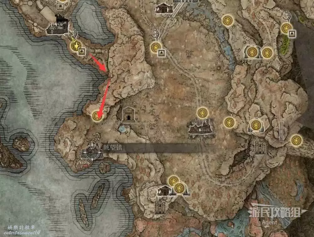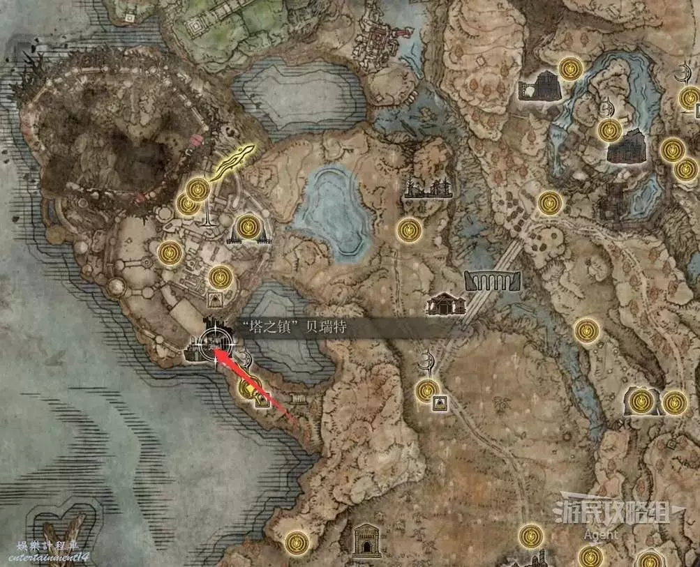 3、“塔之鎮”貝瑞特城外,沿下圖的隱蔽路線可抵達高處的眺望鎮。