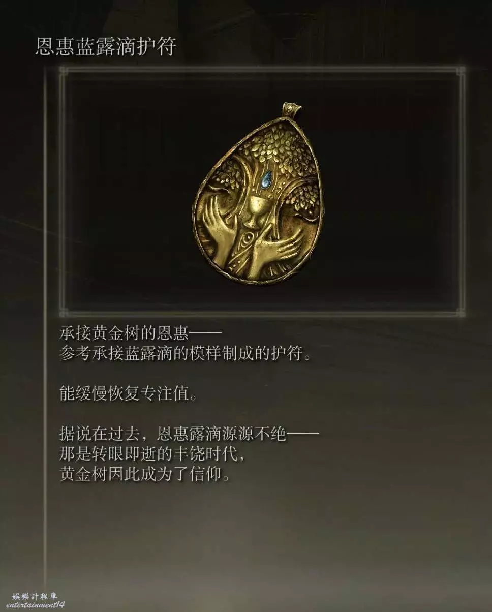 艾爾登法環 (Elden Ring) 黃金樹幽影DLC 恩惠藍露滴護符獲取路線 21 6 月 2024-06-21 廣告 作者:食丟皮蛋澀 來源:艾爾登法環吧 恩惠藍露滴護符,能緩慢恢復專注值,目測大約兩秒回一點,這個速度可能對於法師來說很雞肋,但是對於信仰戰士或是戰士這種偶爾放放禱告和戰技的人來說這已經很快了,帶個恢復禱告簡直推圖簡直相當於無限續航。 上個廁所的功夫就又能用一次大恢復了。 獲取路線 應該挺好找的,不過我還是說一下大致的獲取路線吧: