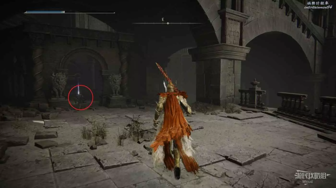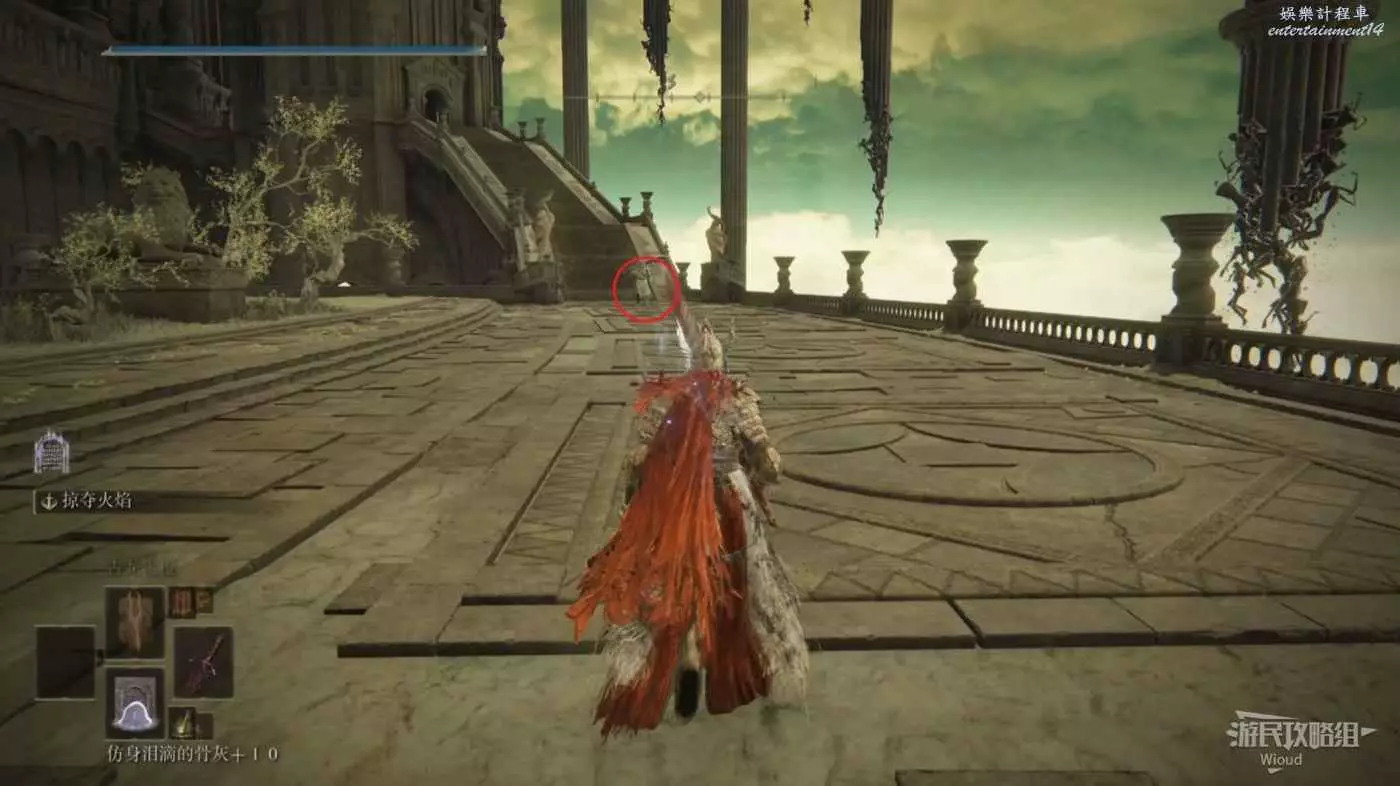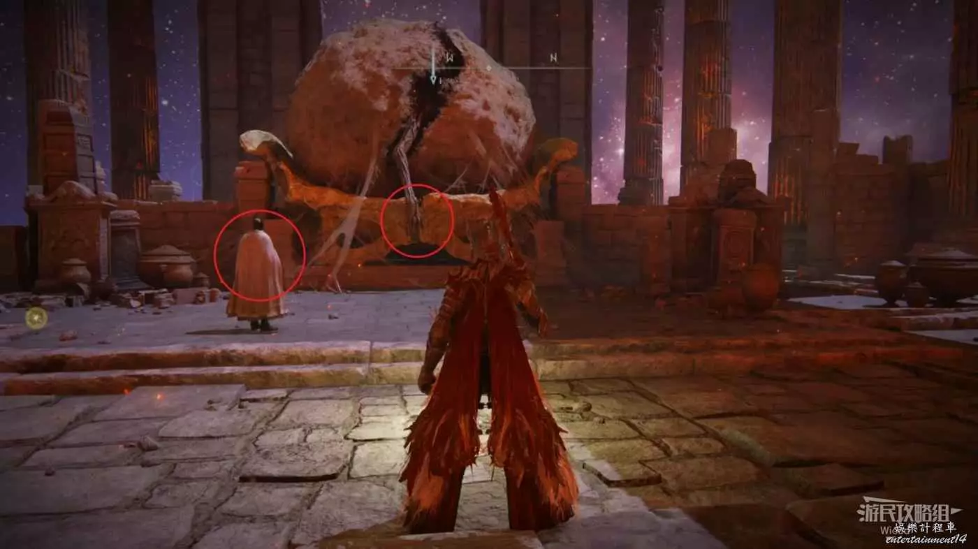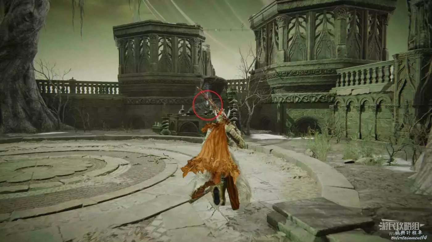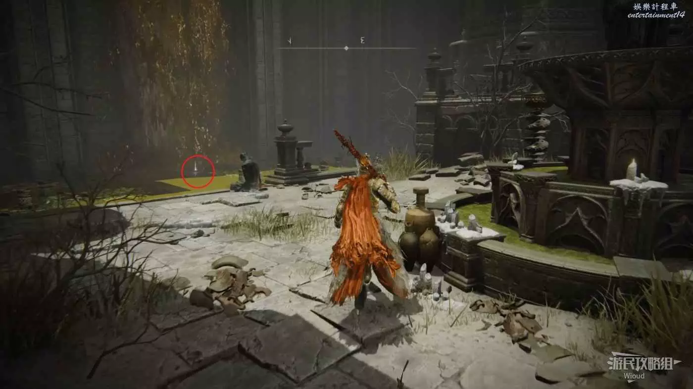 此處可以看到左右兩邊各有一個圓形建築,我們往左側的那一個走,中間雕像的位置可以撿到一個【靈灰】。