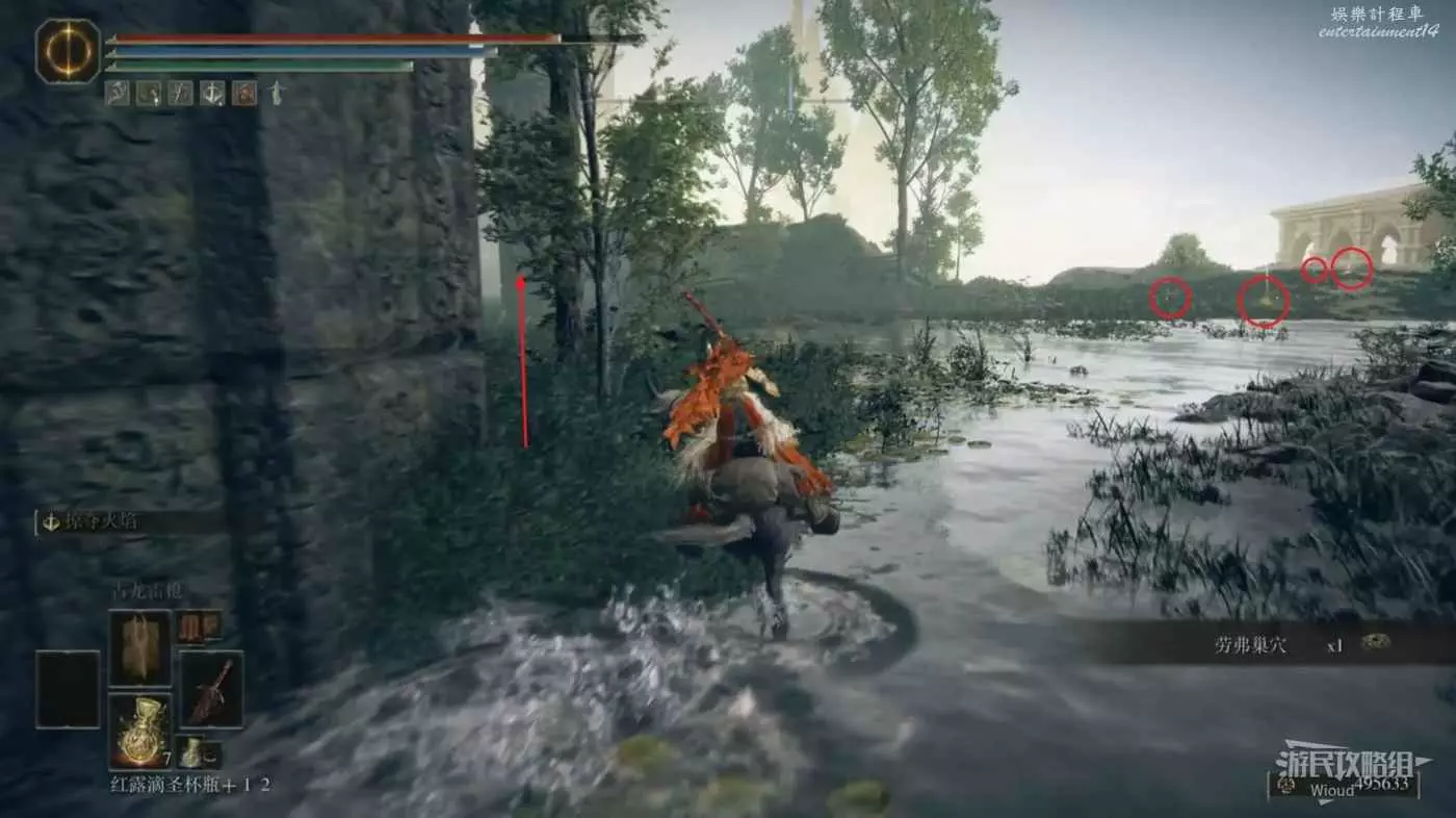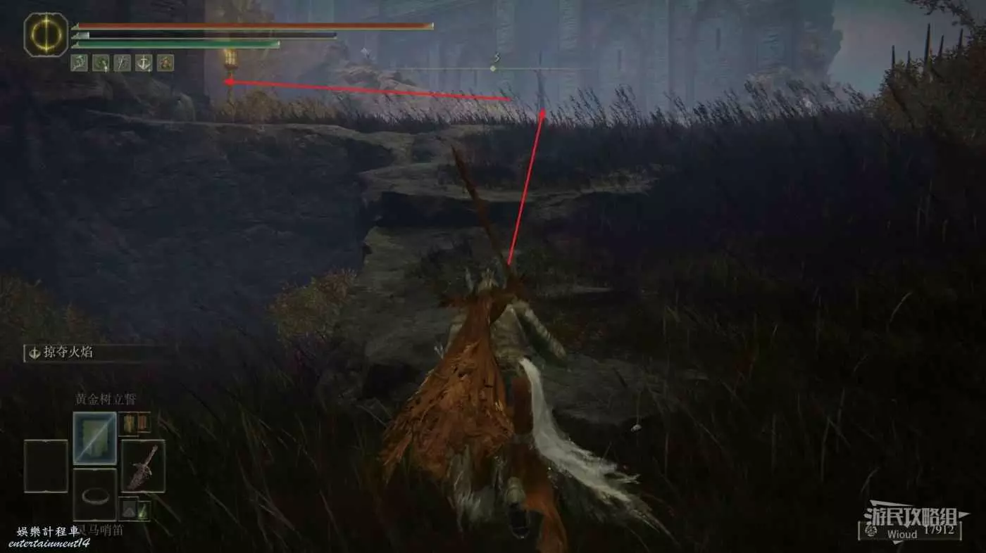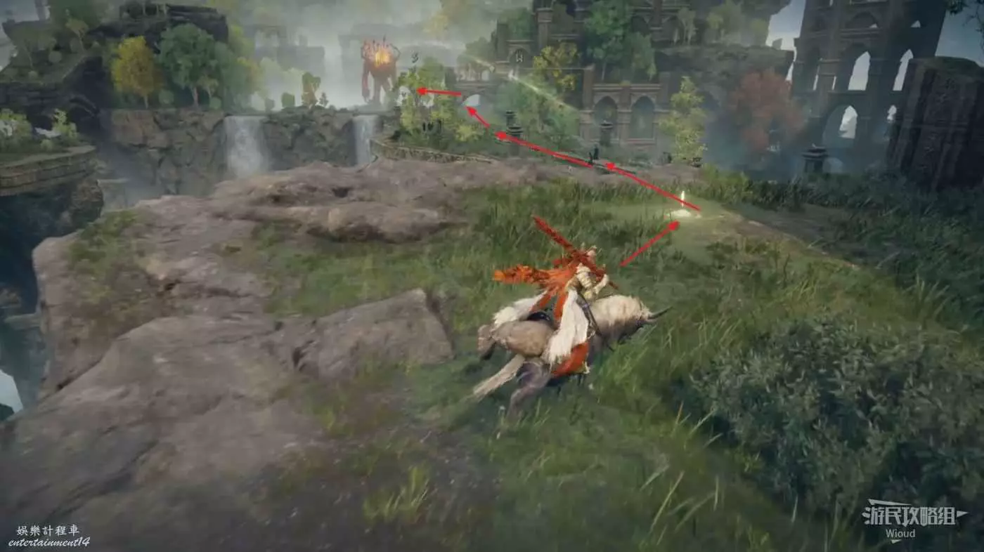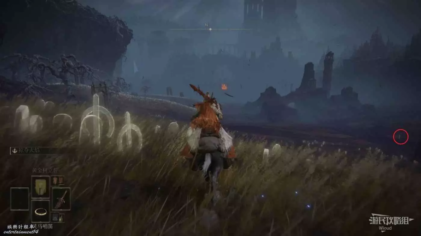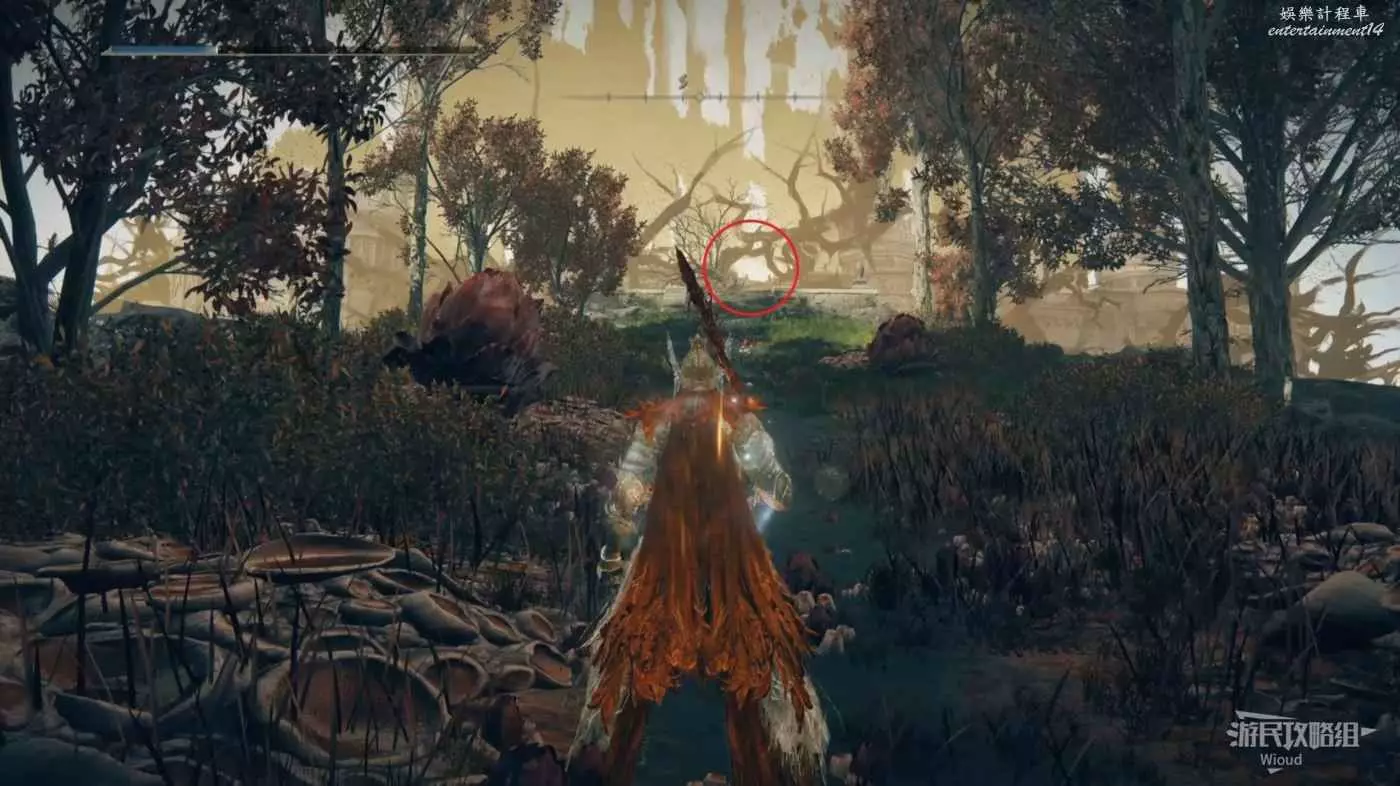 回到第二個賜福點,打開地圖按照下圖所示路線走到畫圈的位置,中間會遇到火巨人,建議目前不要跟它糾纏太久,直接騎馬繞過它。