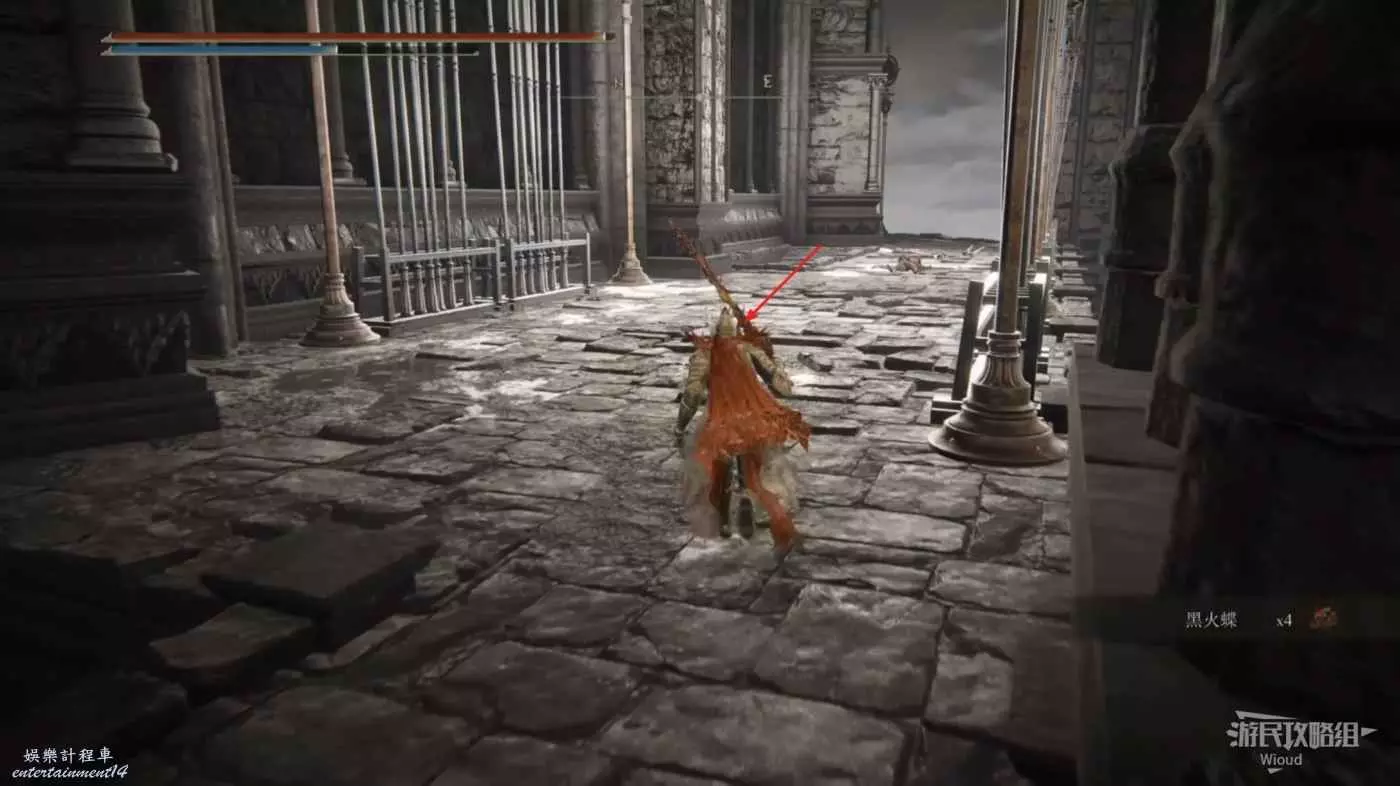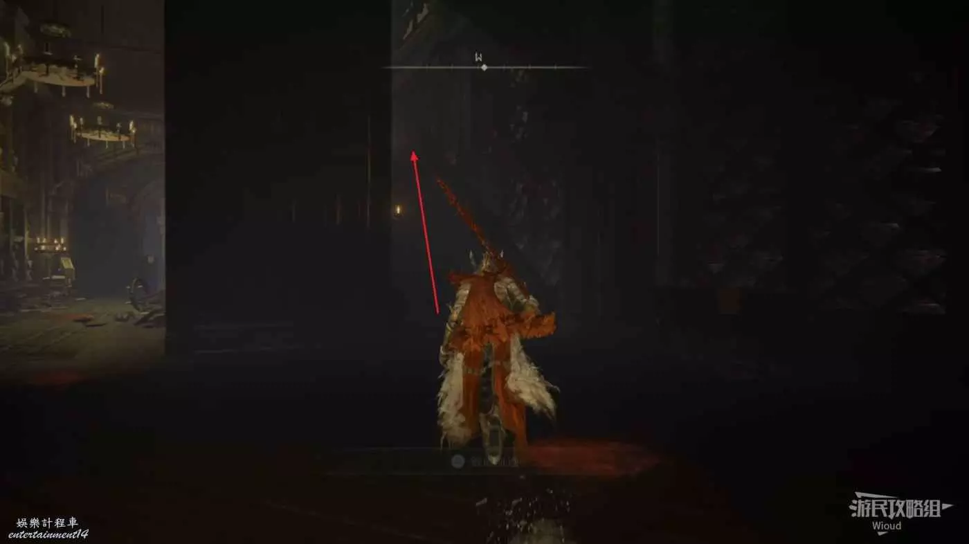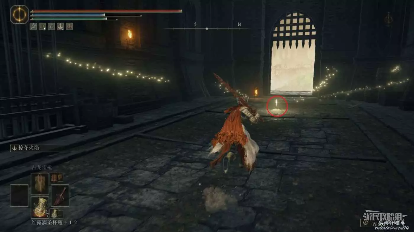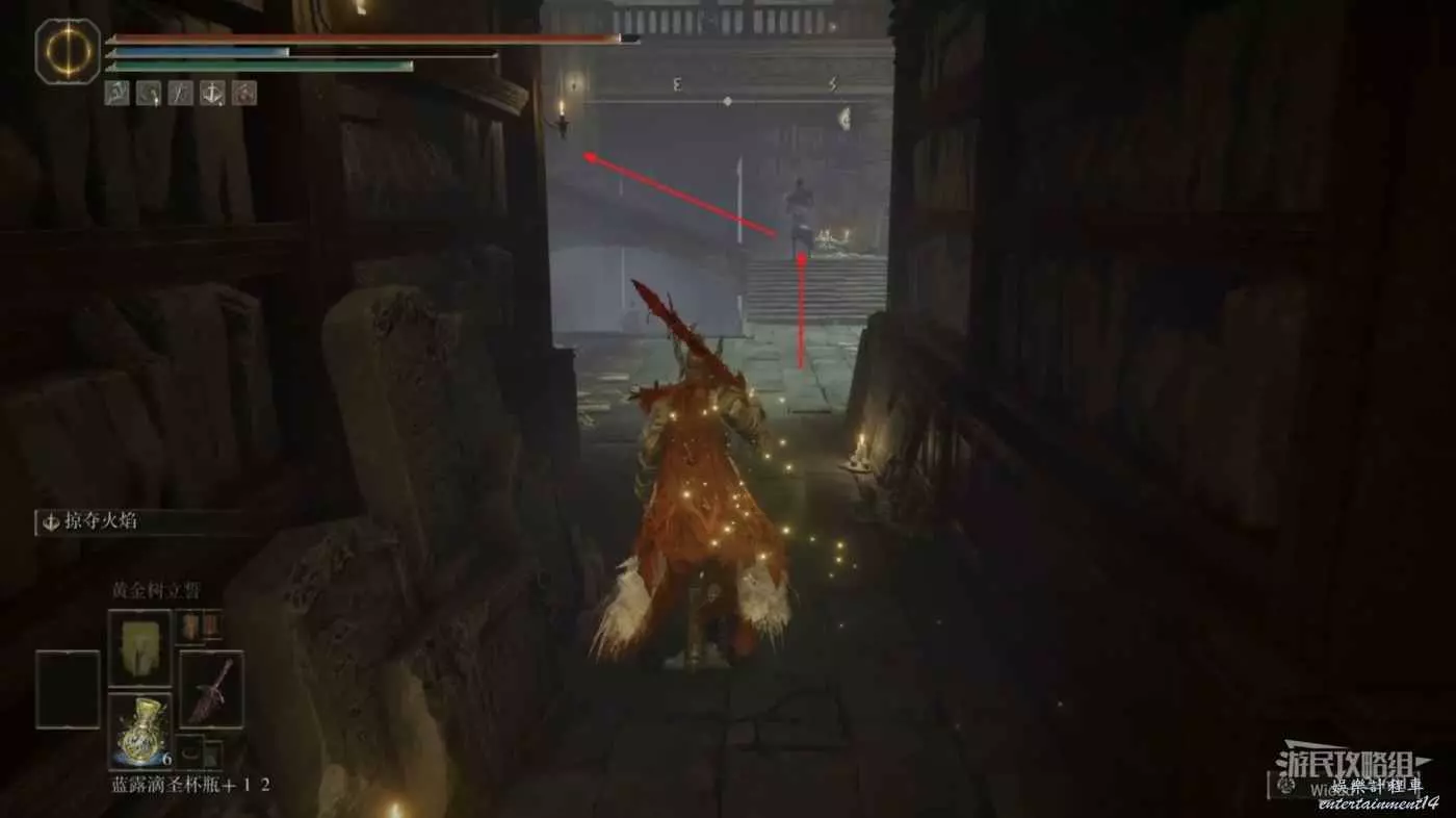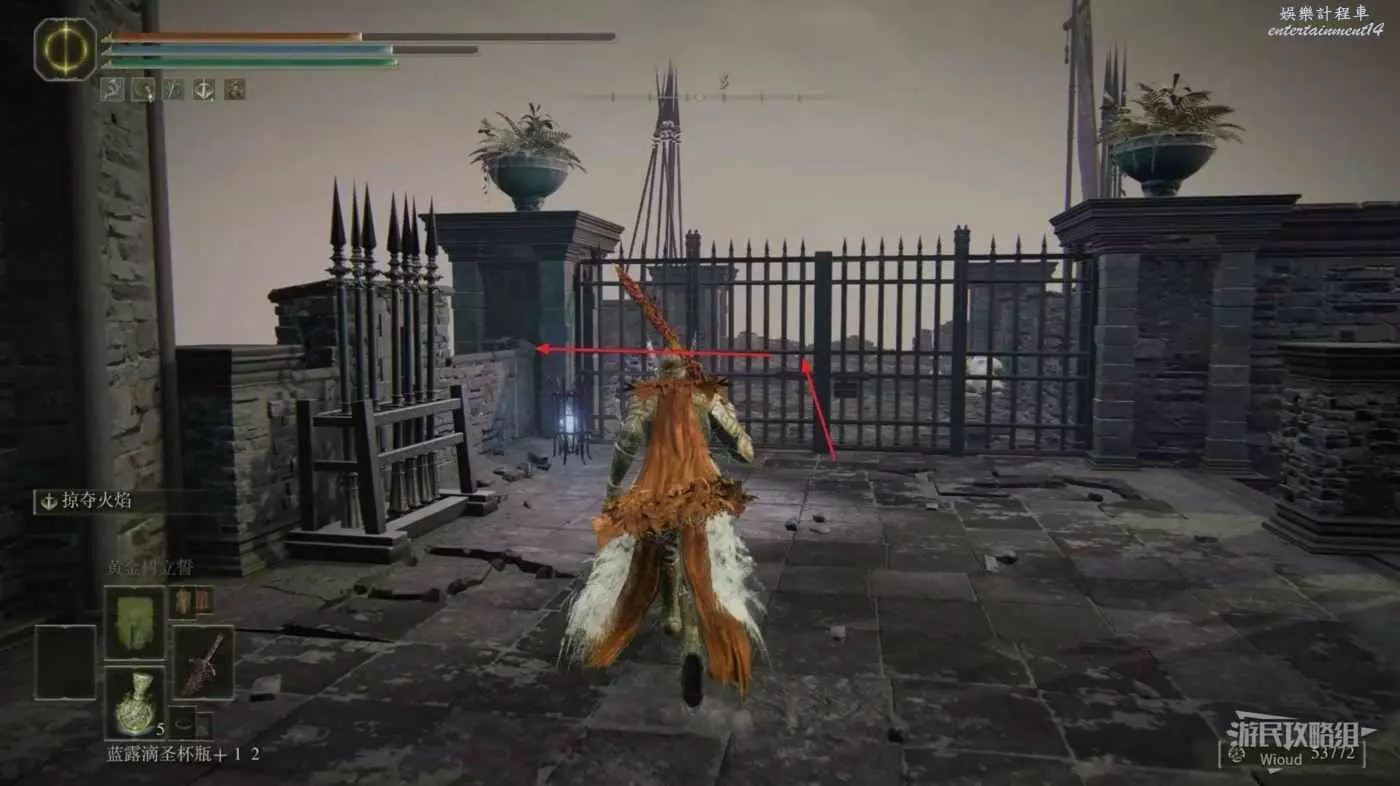 進入建築直接直走,借助下方的燭台跳到柵欄另一邊,可以啟動賜福【第一塔】。