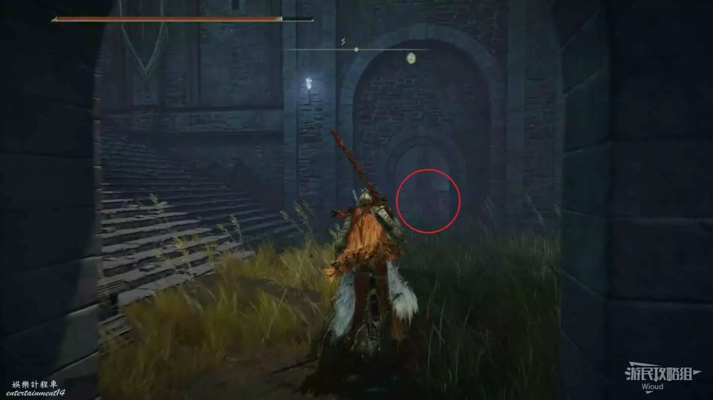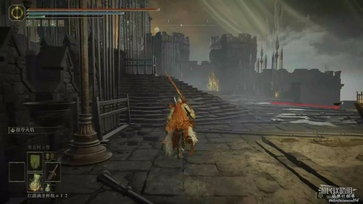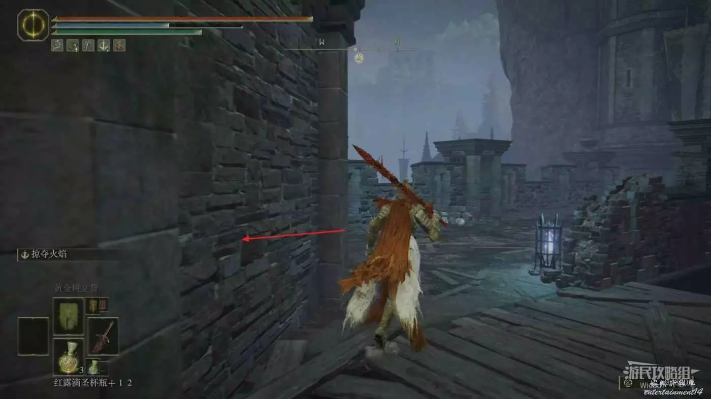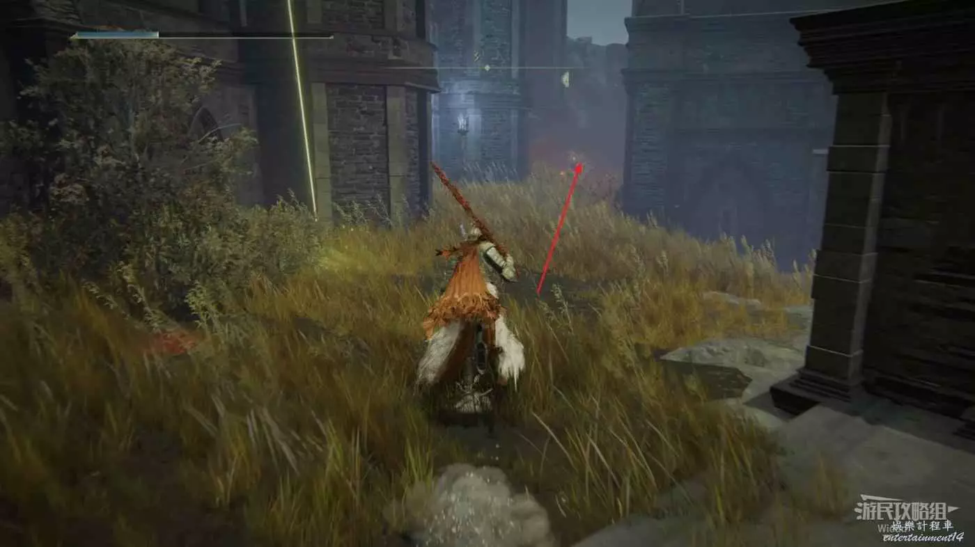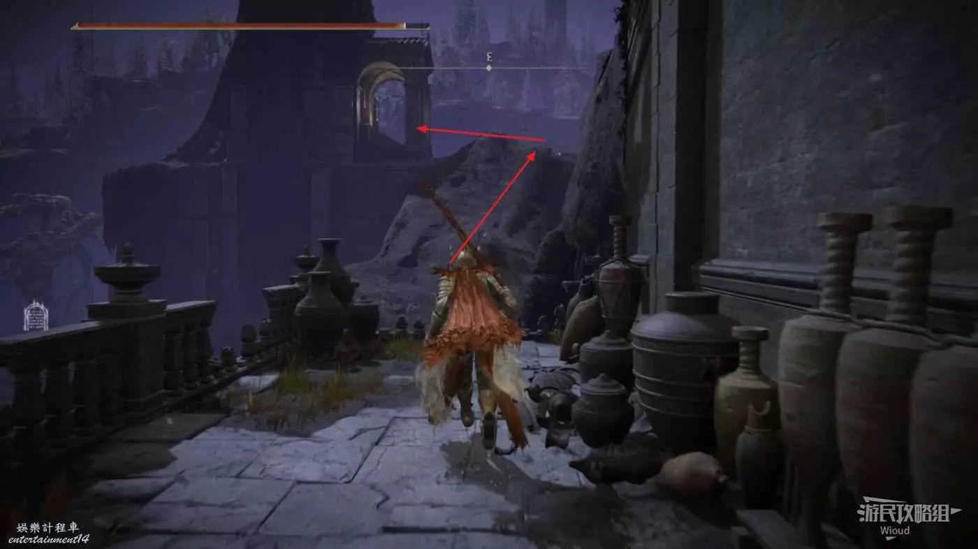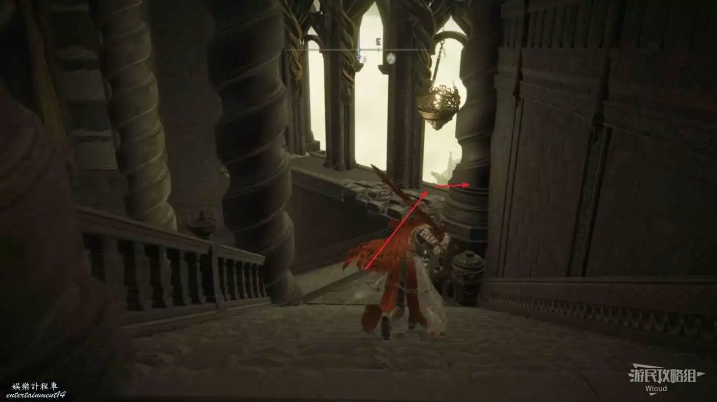 進入建築直接直走,借助下方的燭台跳到柵欄另一邊,可以啟動賜福【第一塔】。
