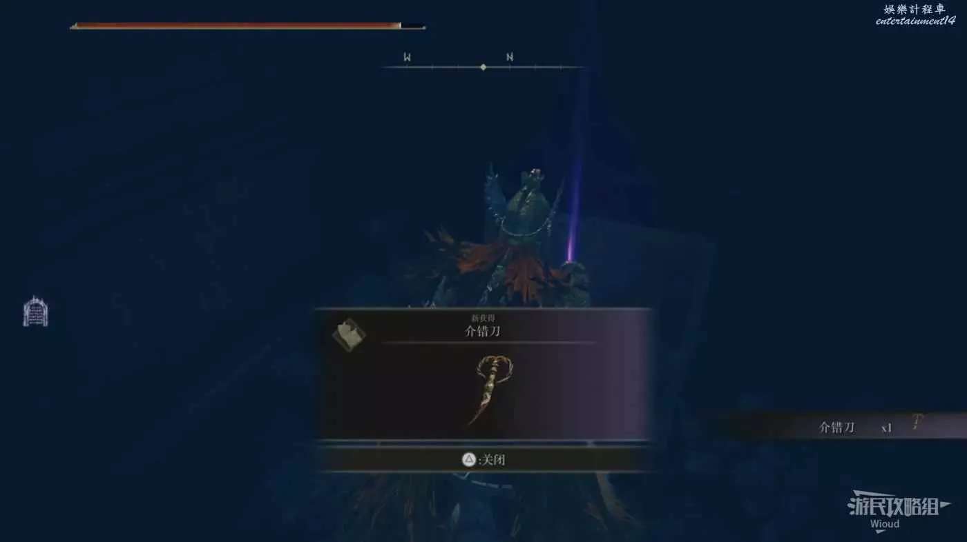 擊敗角戰士可以獲得【角戰士大區劍】,完事繼續沿著樓梯走到頭,能啟動一個賜福,旁邊還有一個【幽影樹碎片】可以拿。