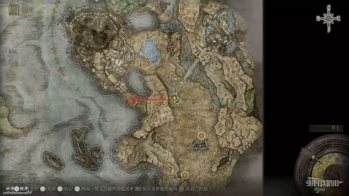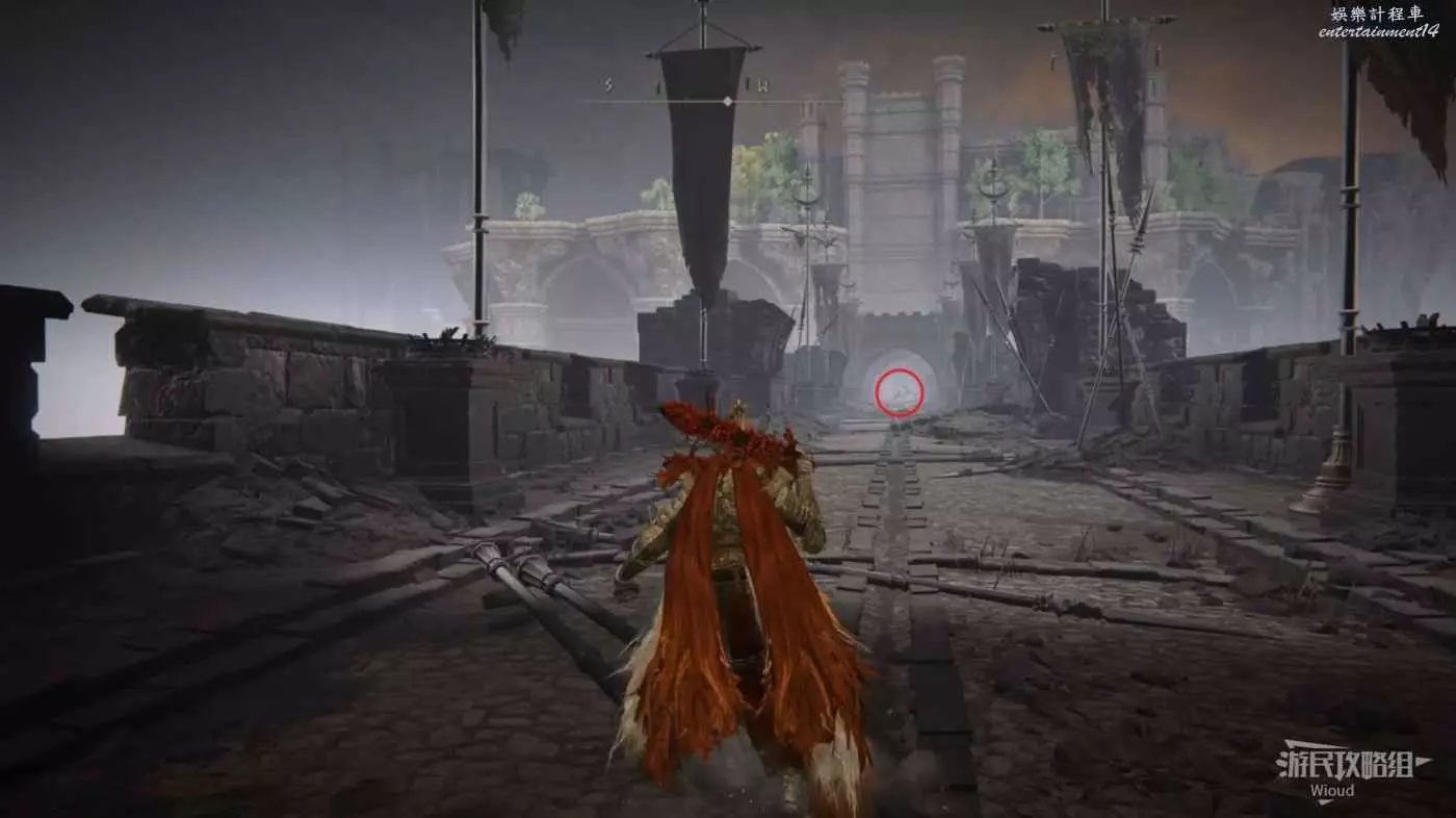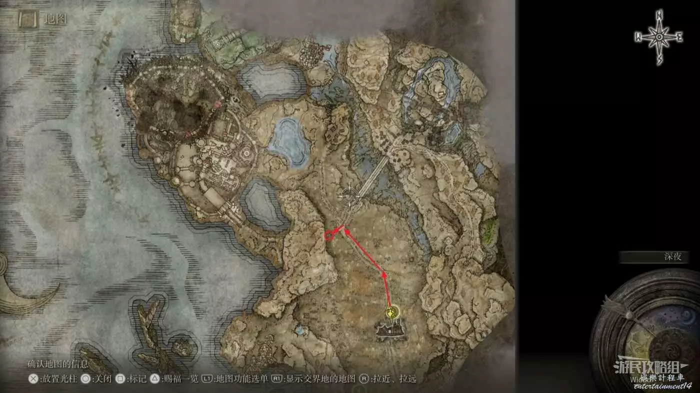 此時打開地圖,我們直接傳送到賜福【三叉口的十字記號】,從此處開始往東走,按照下圖路線過橋就能到達恩希斯城的門口。