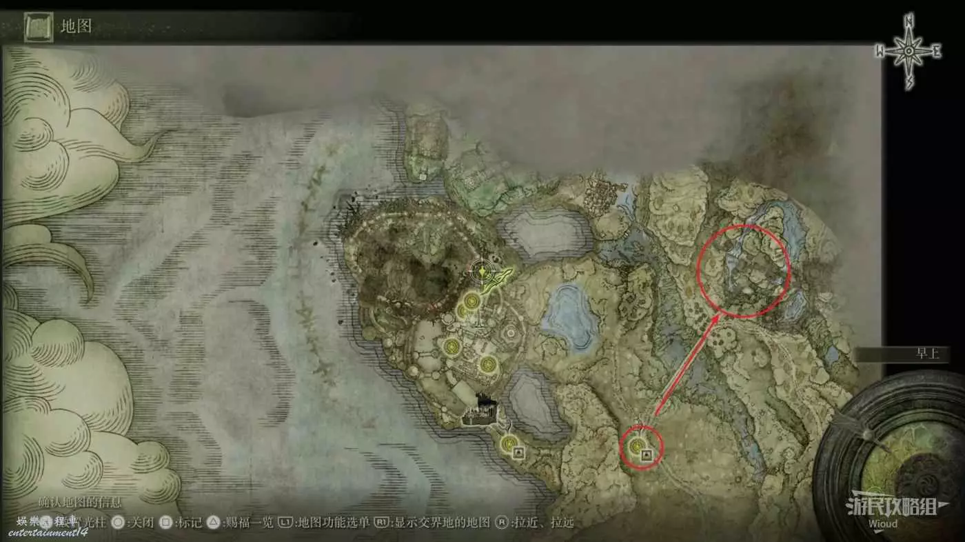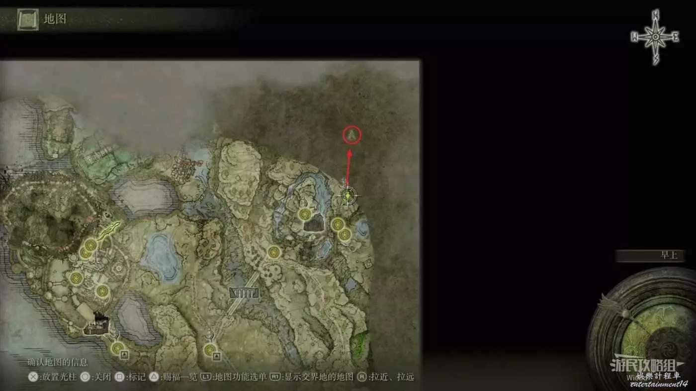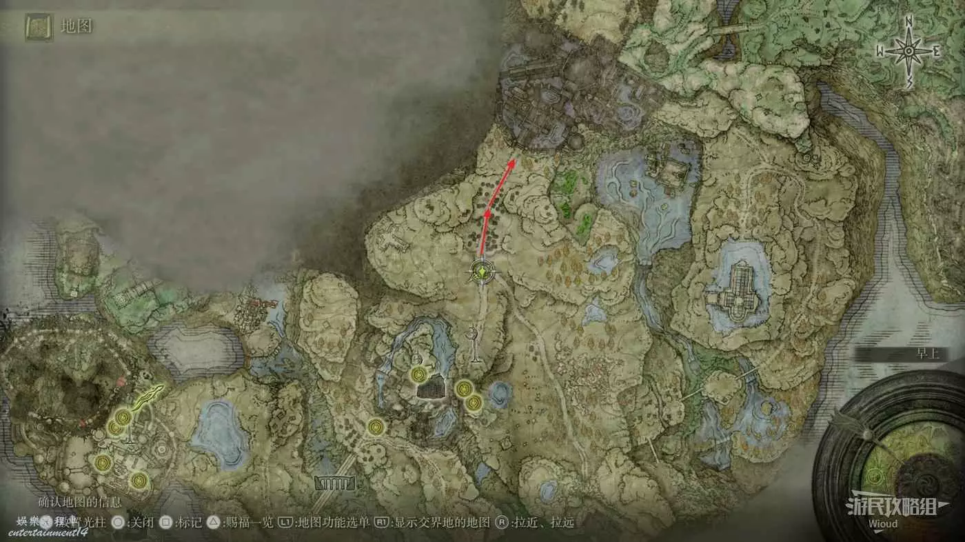 此時打開地圖,我們直接傳送到賜福【三叉口的十字記號】,從此處開始往東走,按照下圖路線過橋就能到達恩希斯城的門口。