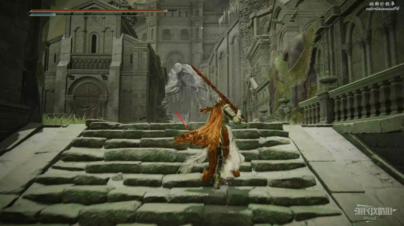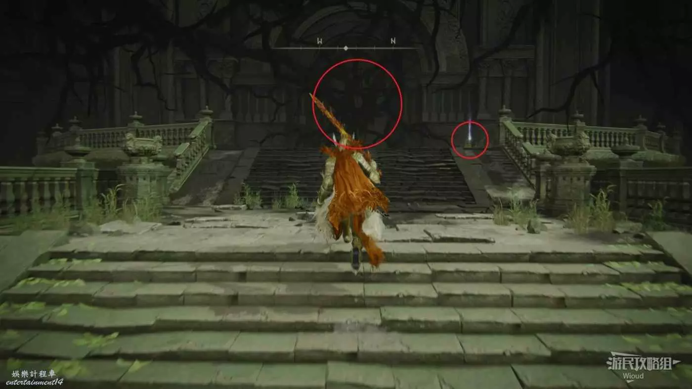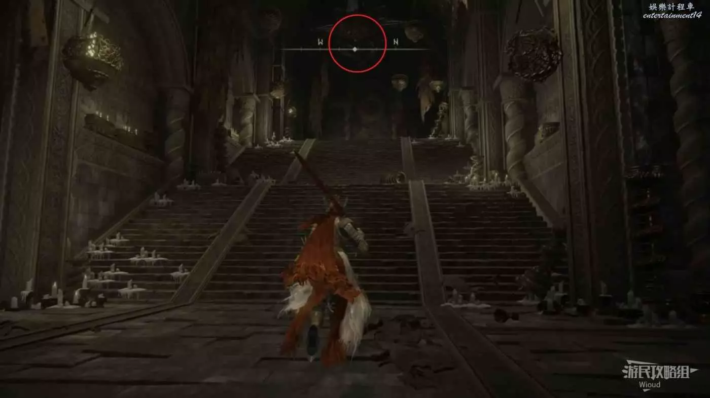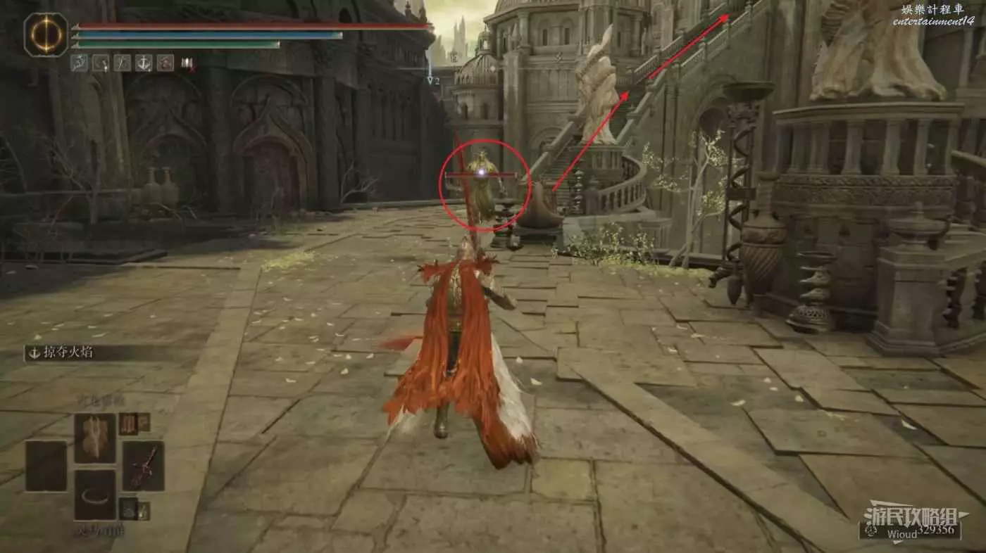 穿過巨人可以看到右側有一個可以進入的房間,房間內有一個持盾的魔法劍士,房間入口左側可以拾取一個盧恩,隨後沿著左側的樓梯一直往上走。