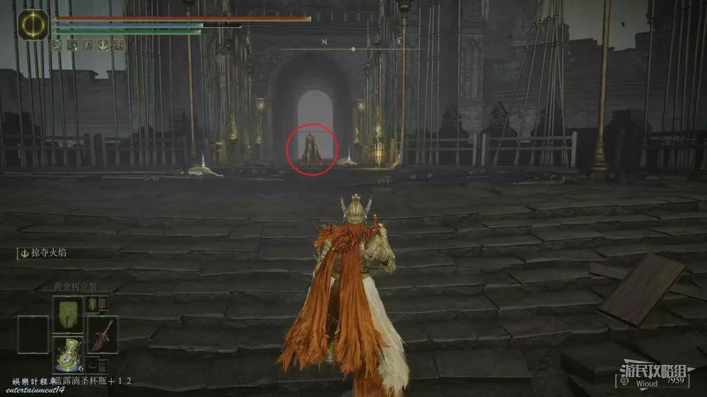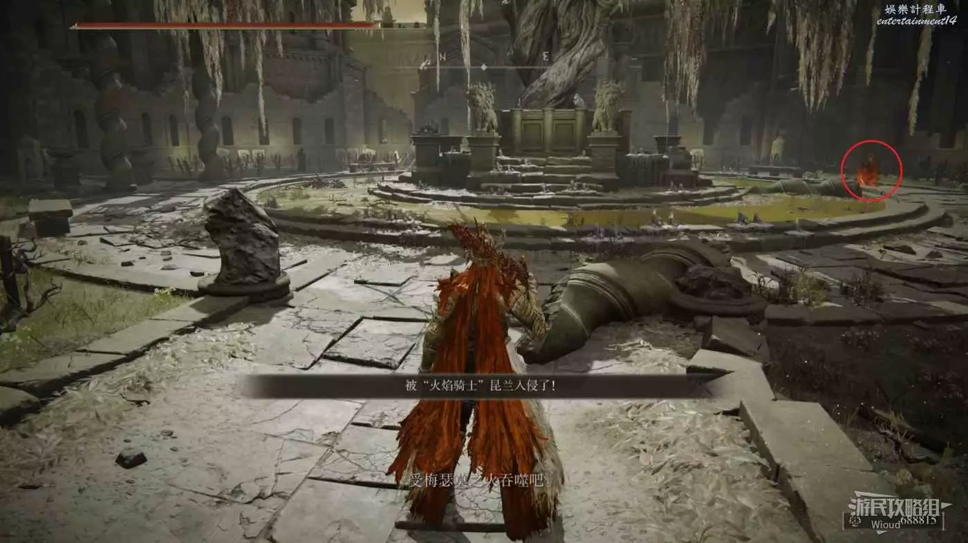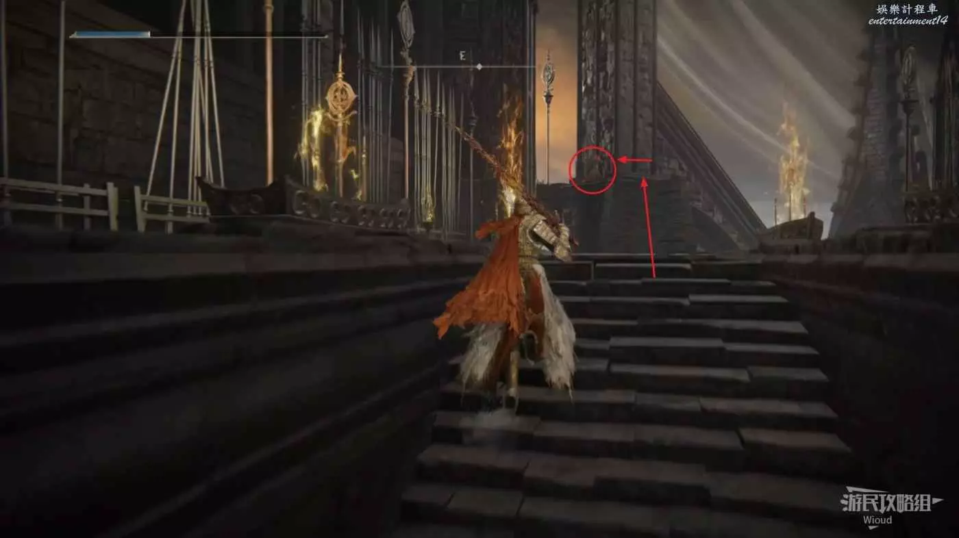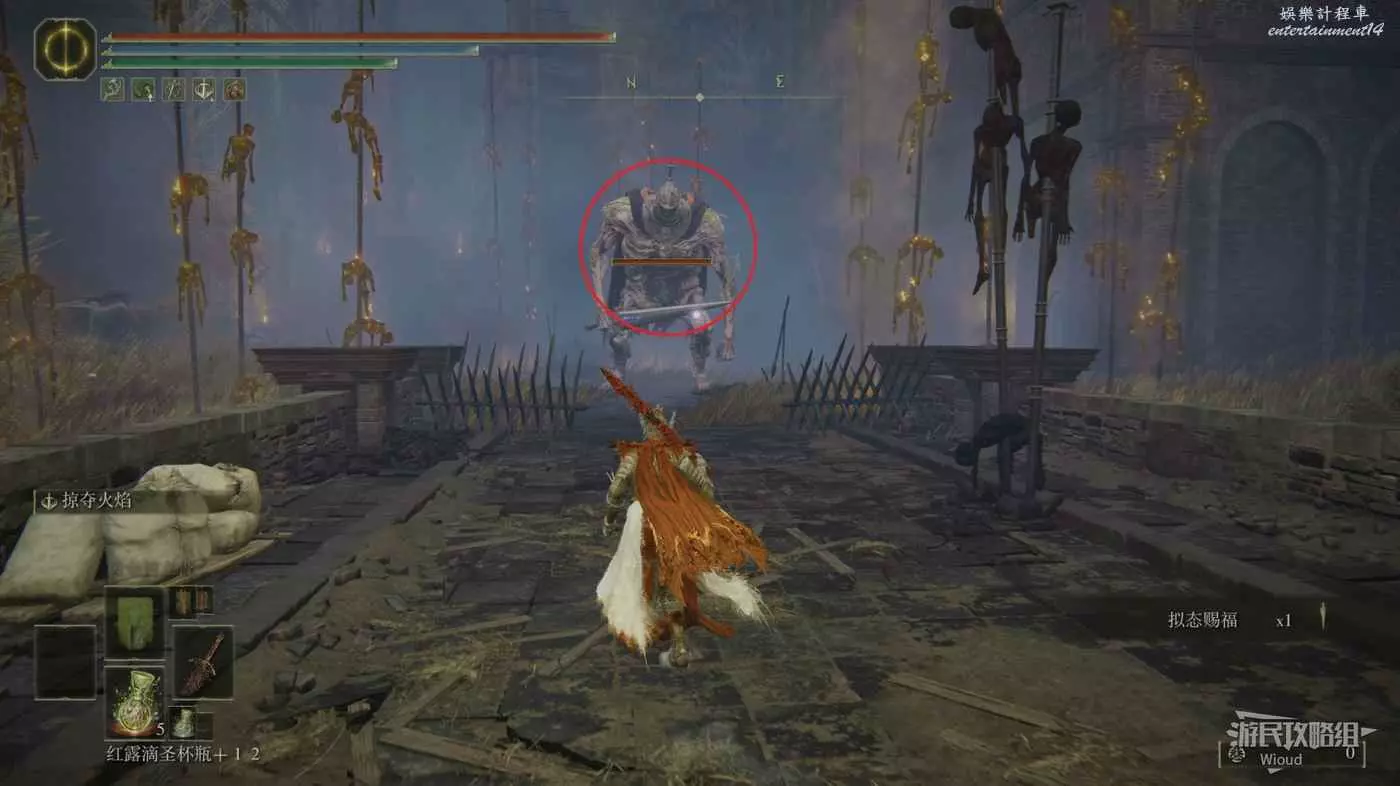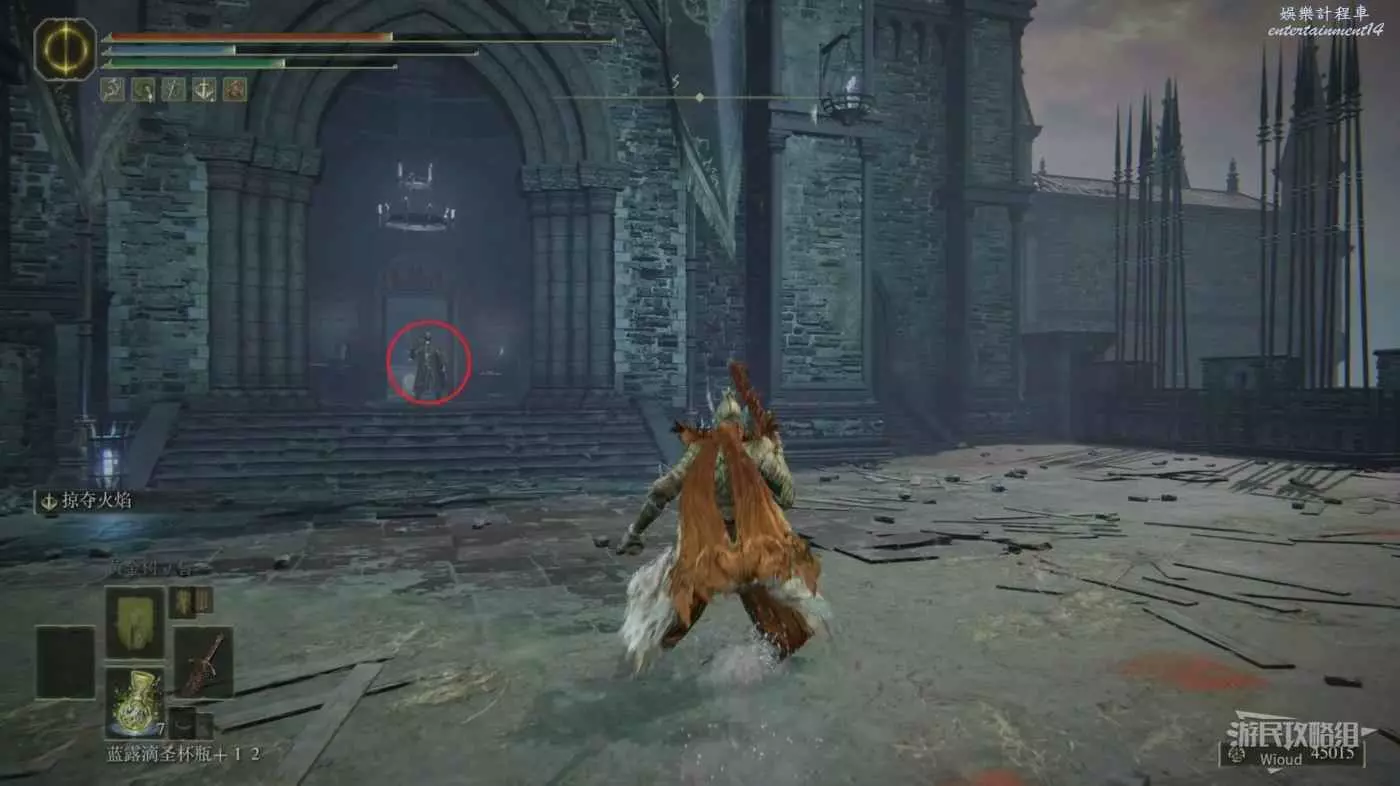 此處會出現一個入侵我們的“火焰騎士昆蘭”,它所使用的武器很長,因此不要誤判它的攻擊距離,總體來說難度不高,使用褻瀆聖劍的輪椅組合可以輕鬆擊敗。