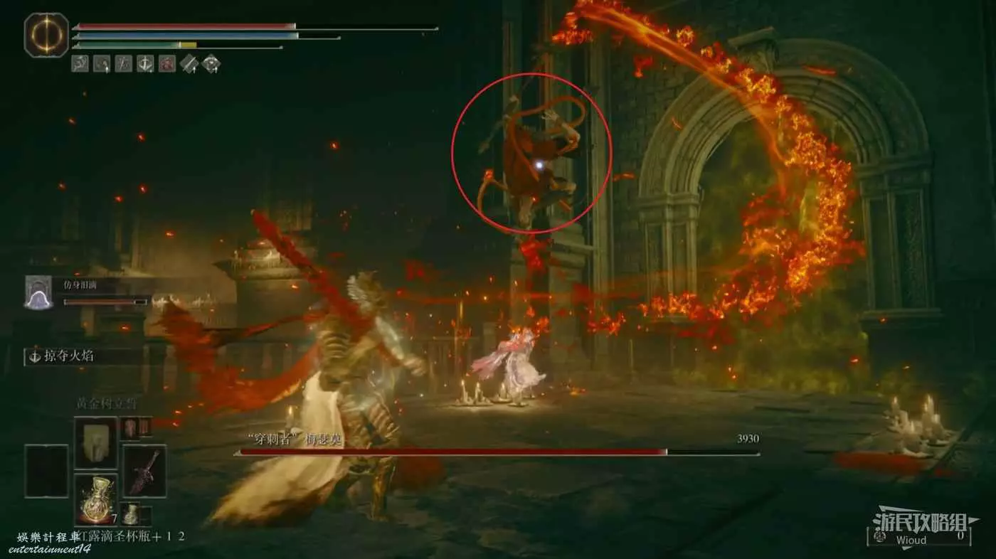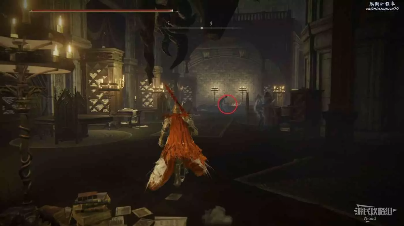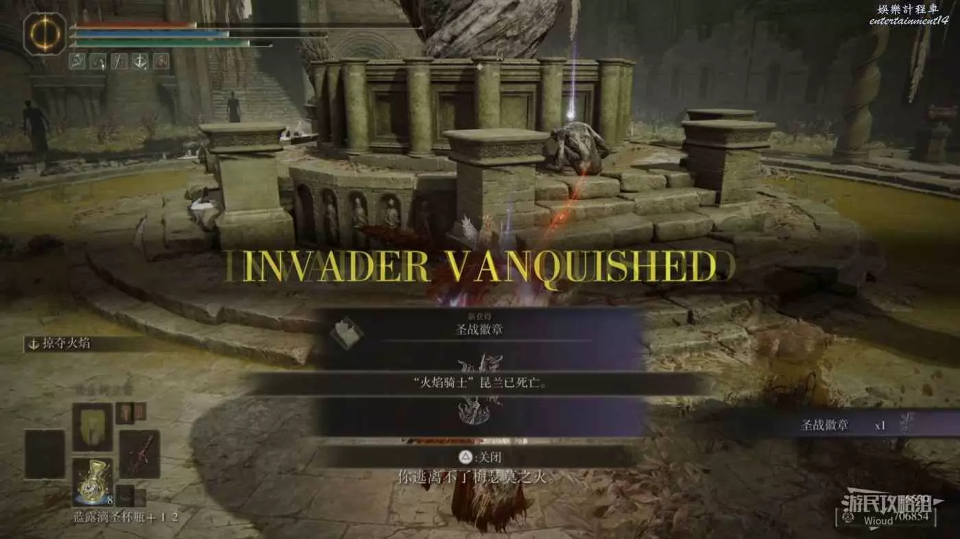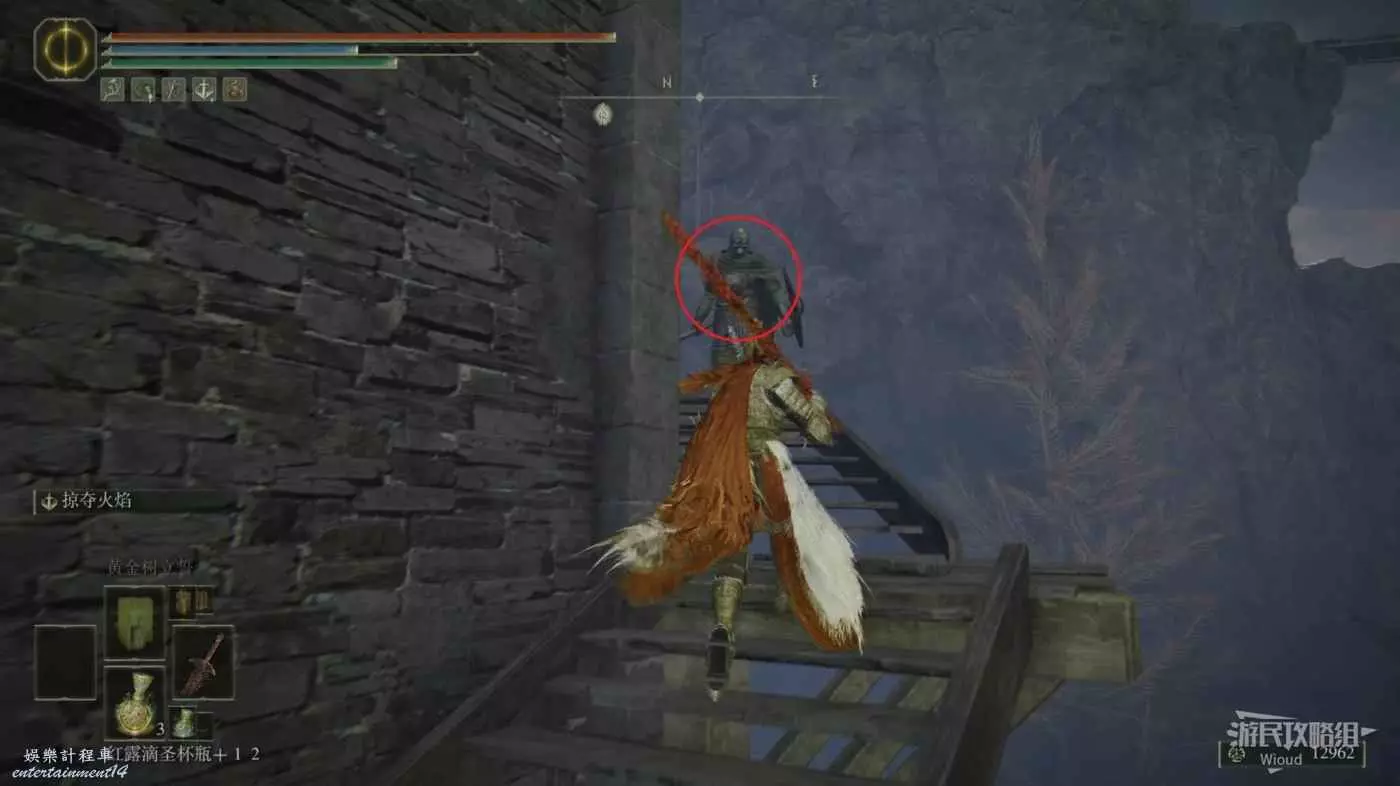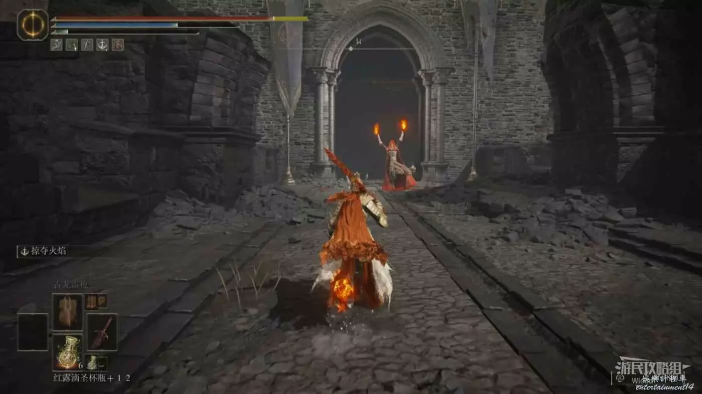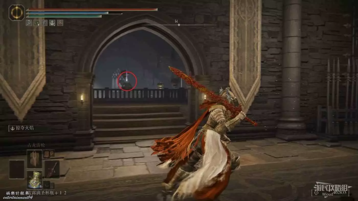 此處會出現一個入侵我們的“火焰騎士昆蘭”,它所使用的武器很長,因此不要誤判它的攻擊距離,總體來說難度不高,使用褻瀆聖劍的輪椅組合可以輕鬆擊敗。