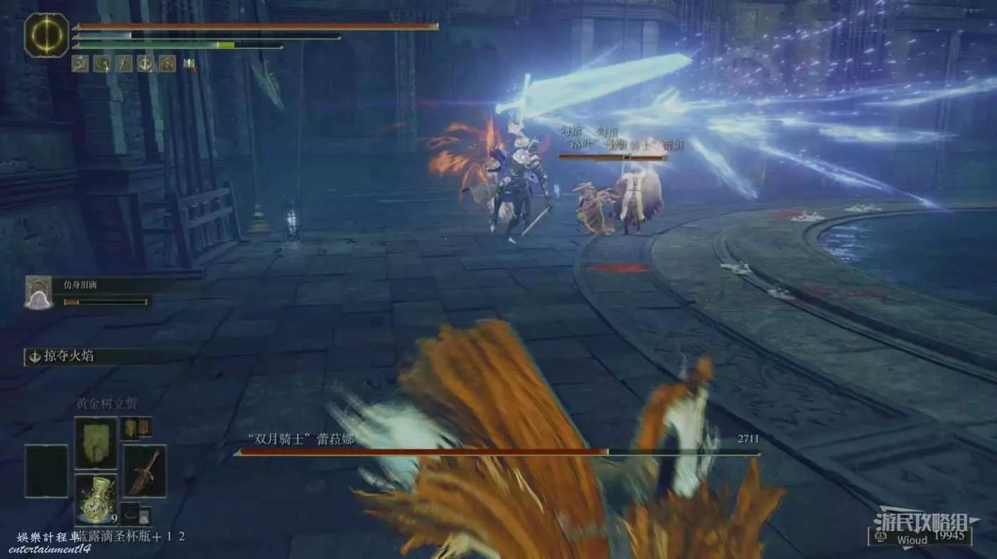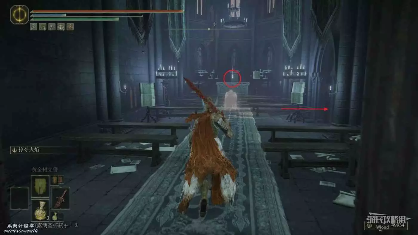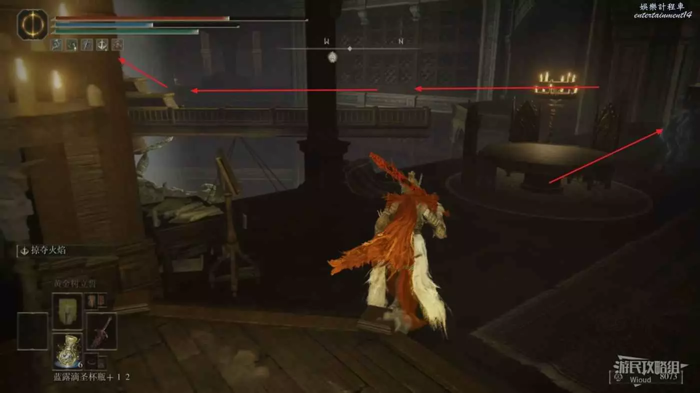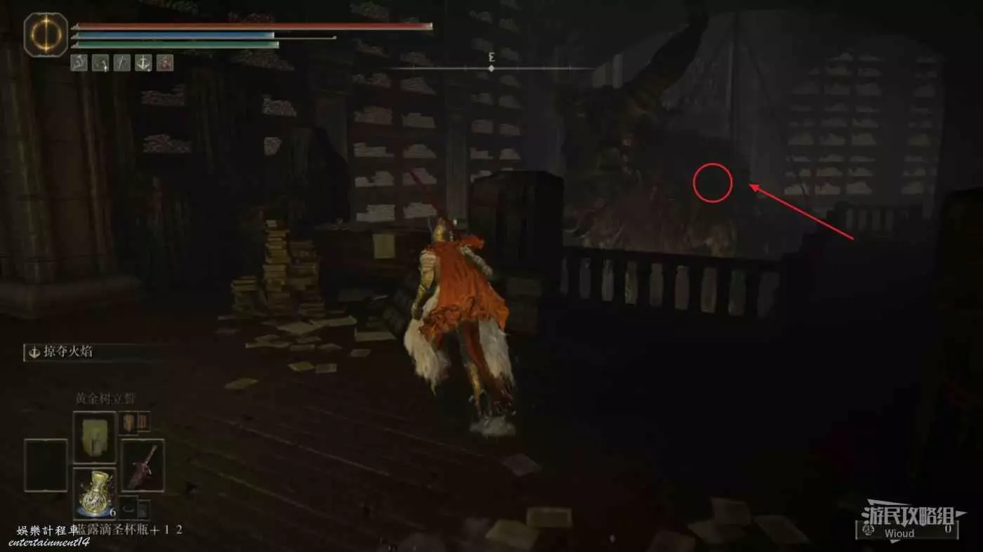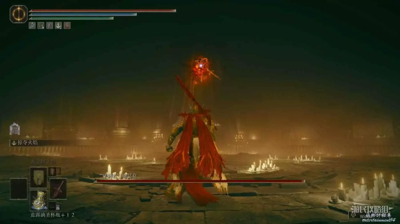 此處會出現一個入侵我們的“火焰騎士昆蘭”,它所使用的武器很長,因此不要誤判它的攻擊距離,總體來說難度不高,使用褻瀆聖劍的輪椅組合可以輕鬆擊敗。