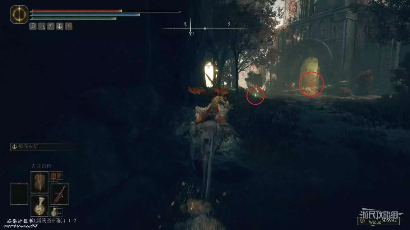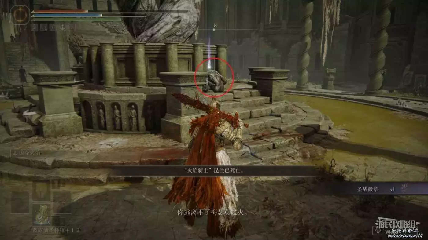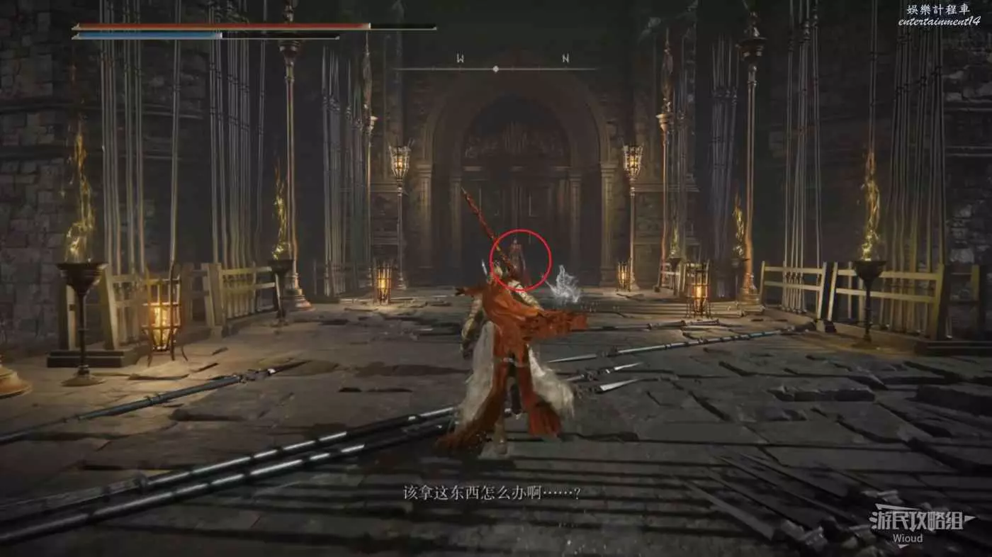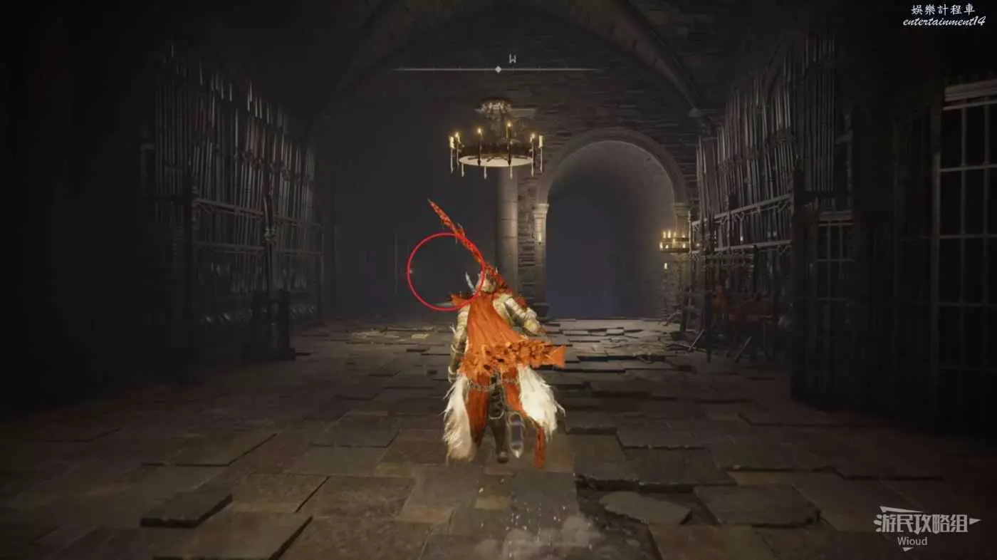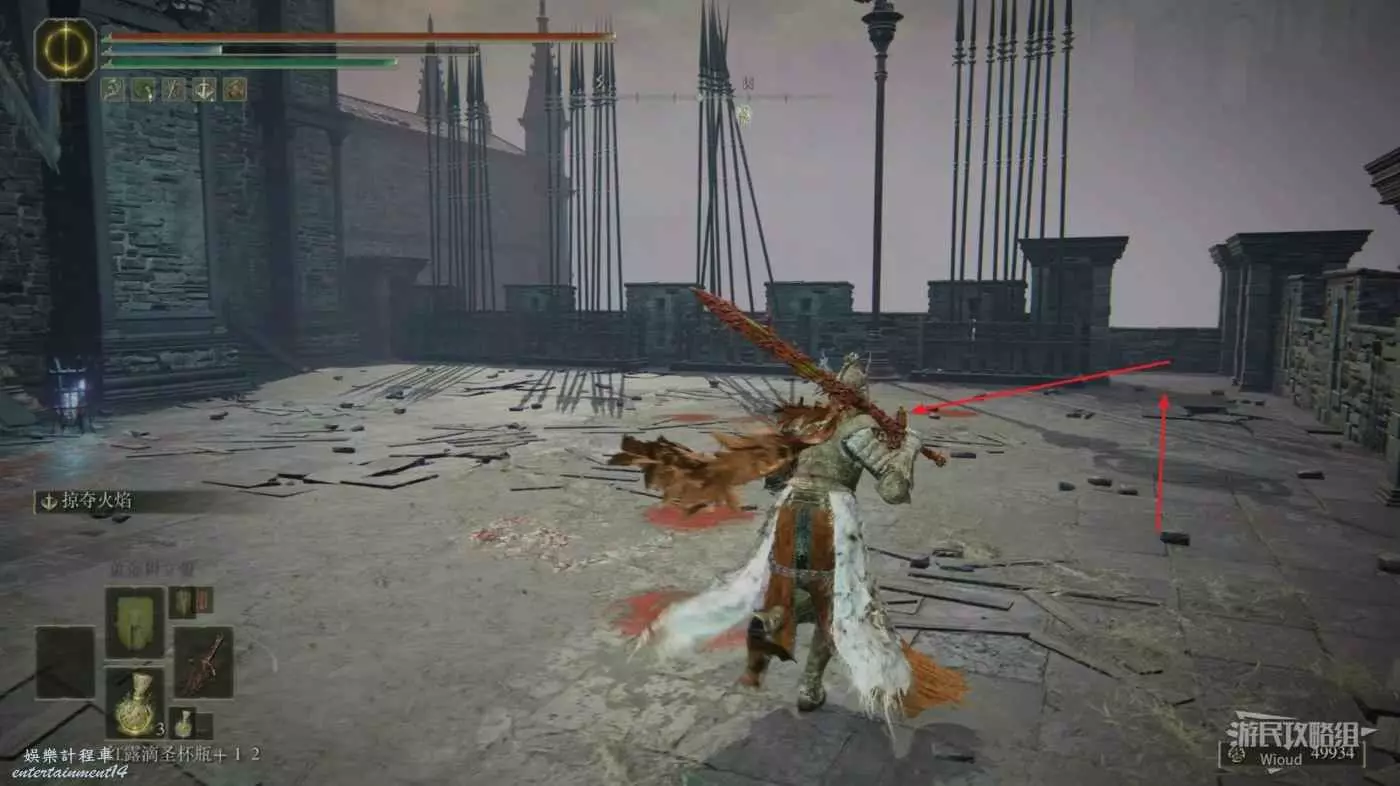 此處會出現一個入侵我們的“火焰騎士昆蘭”,它所使用的武器很長,因此不要誤判它的攻擊距離,總體來說難度不高,使用褻瀆聖劍的輪椅組合可以輕鬆擊敗。