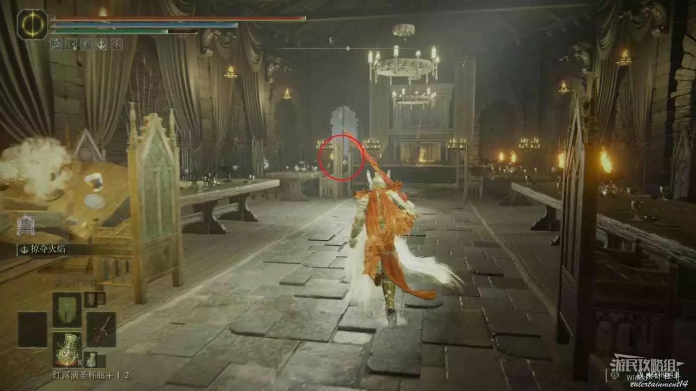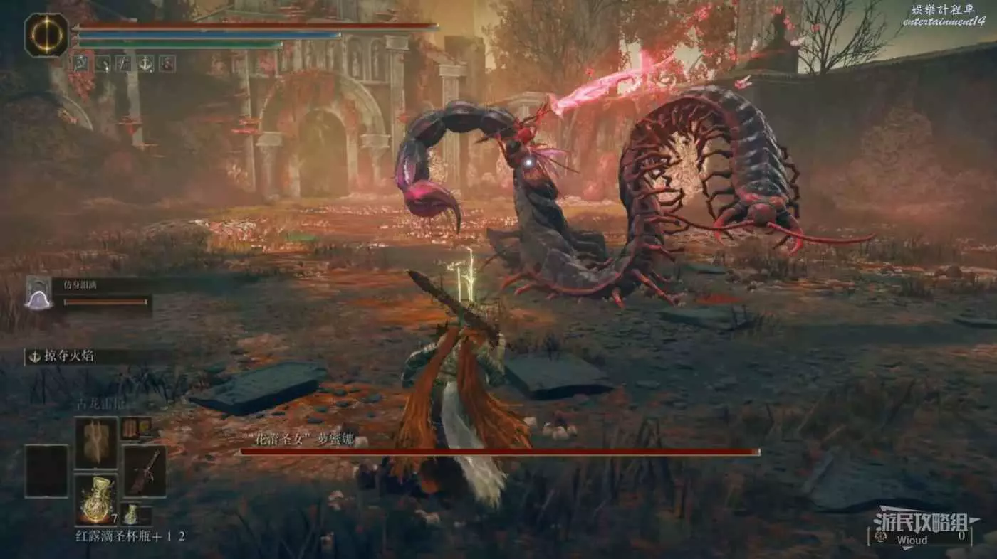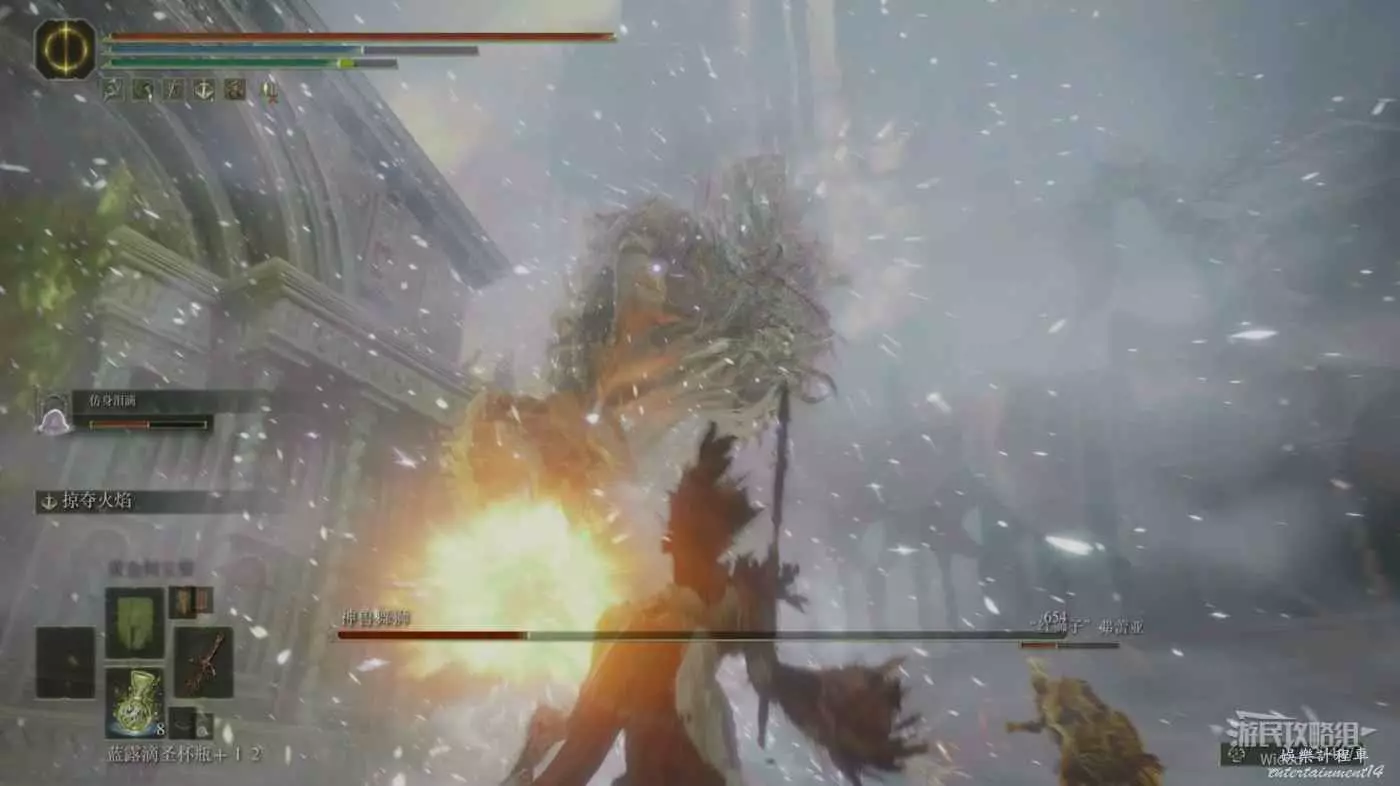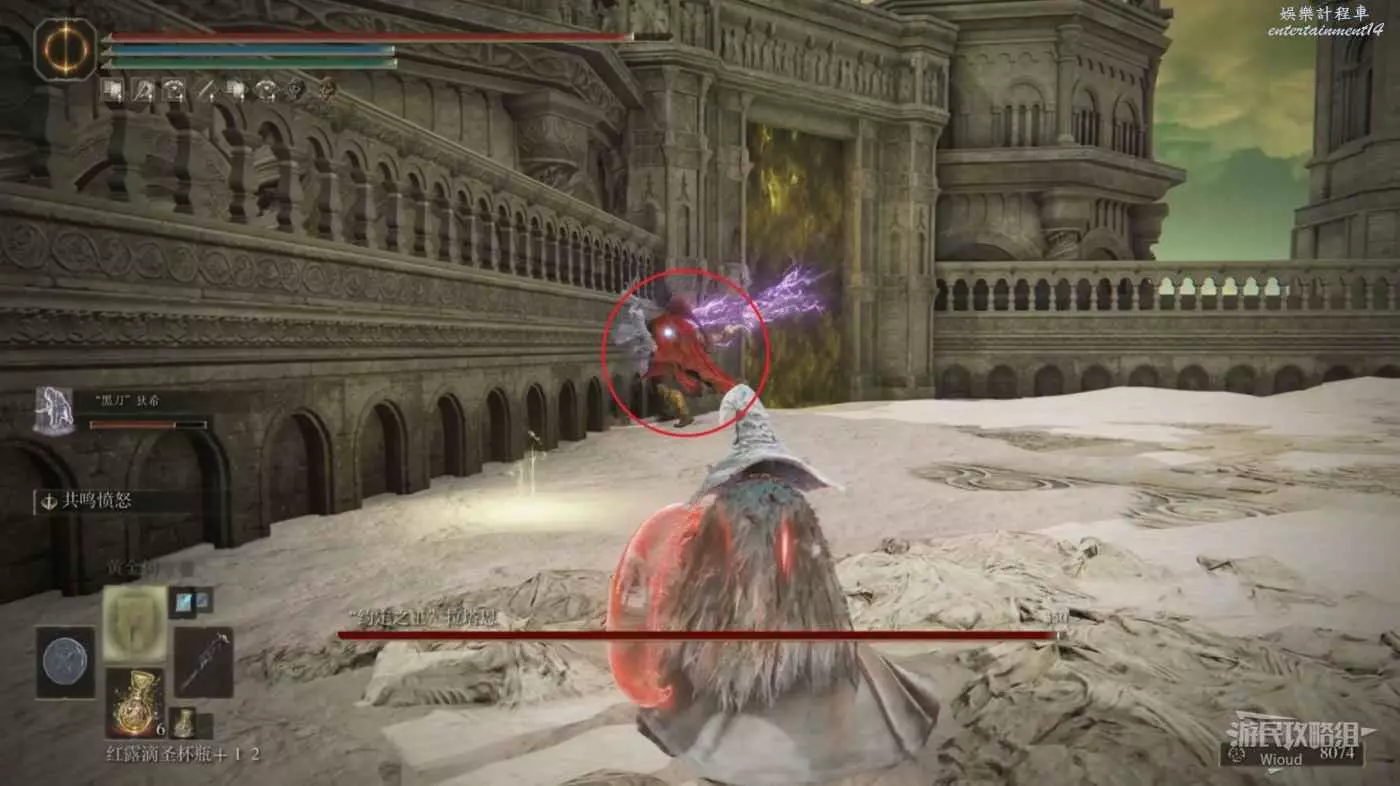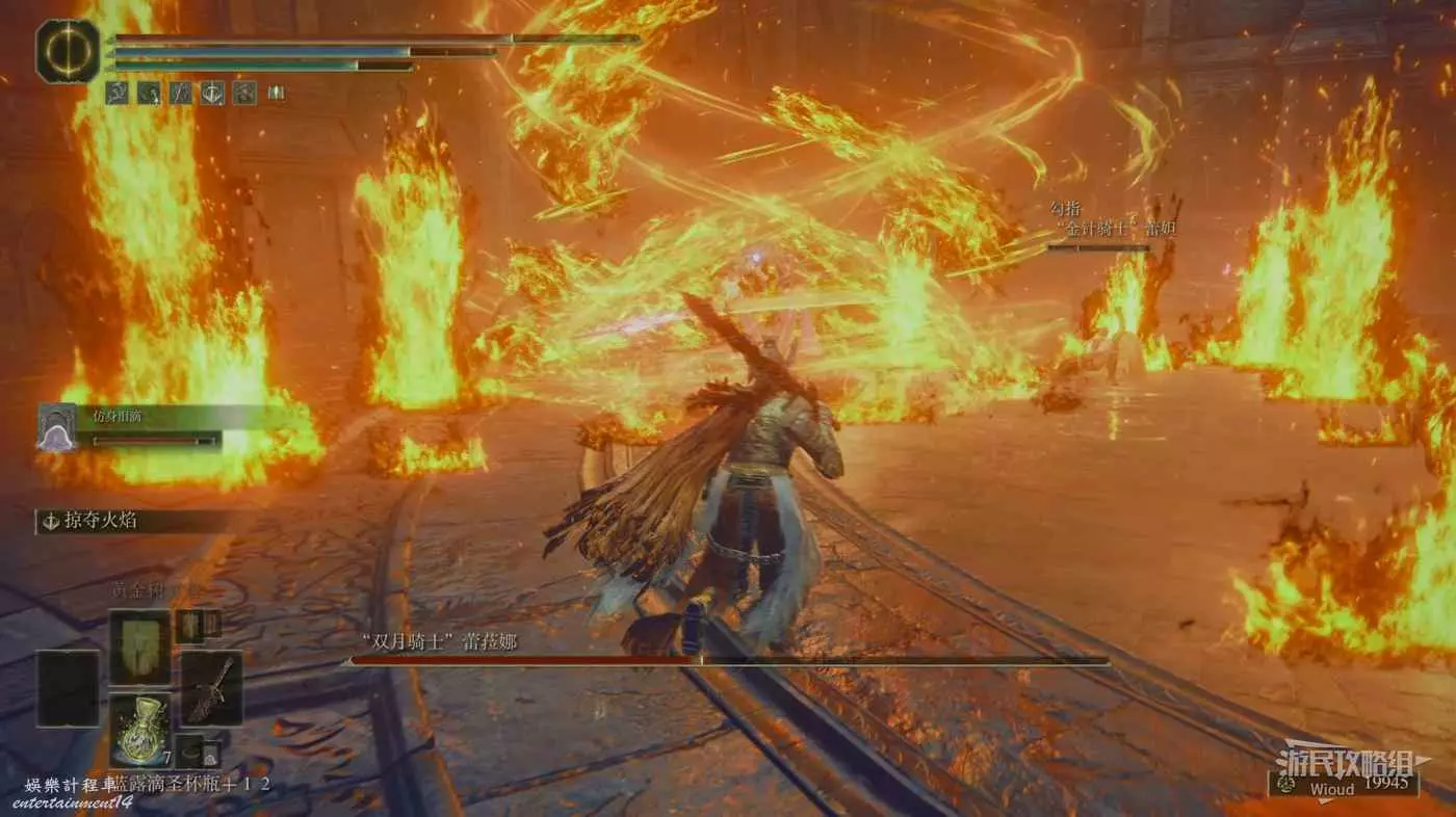 此處會出現一個入侵我們的“火焰騎士昆蘭”,它所使用的武器很長,因此不要誤判它的攻擊距離,總體來說難度不高,使用褻瀆聖劍的輪椅組合可以輕鬆擊敗。