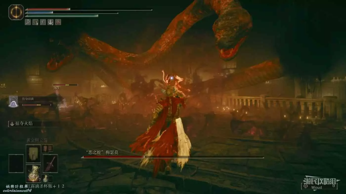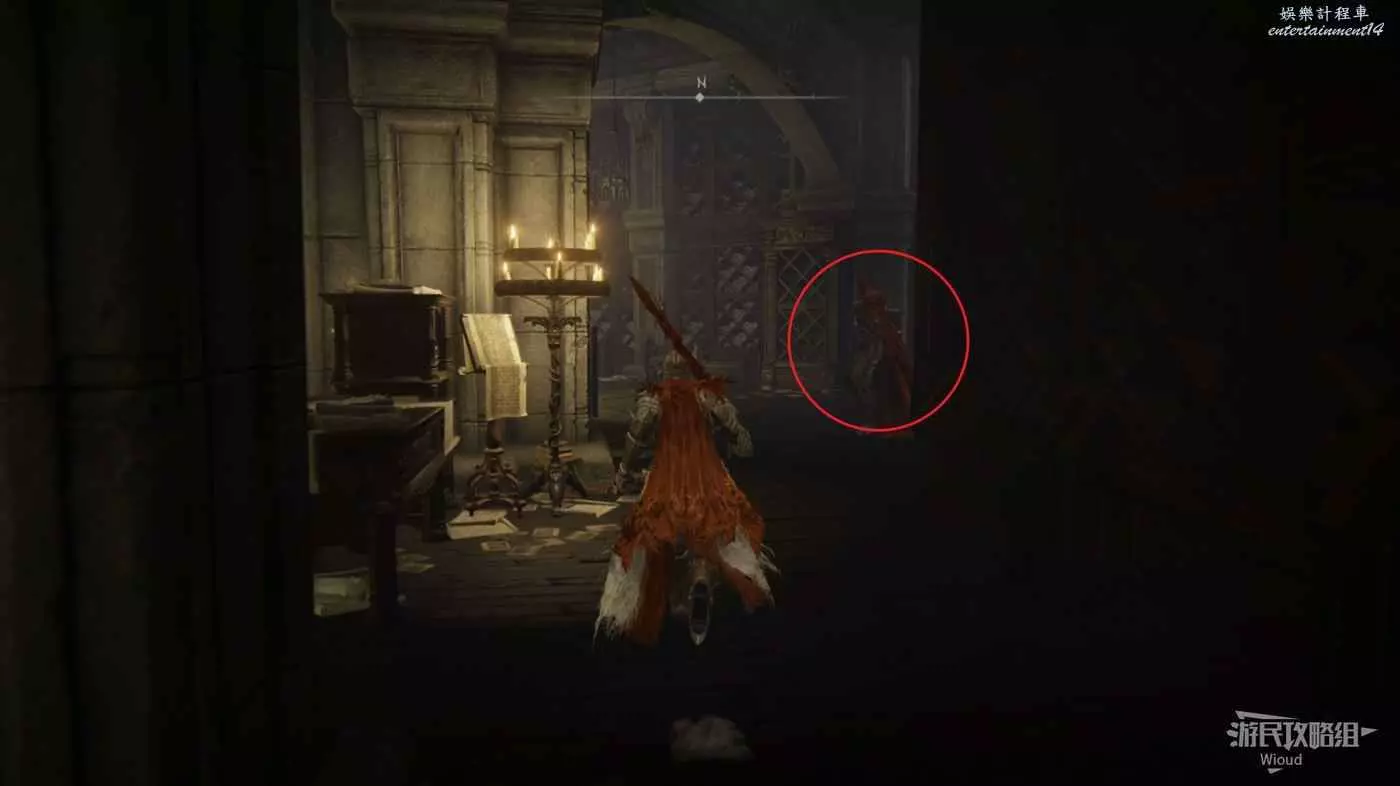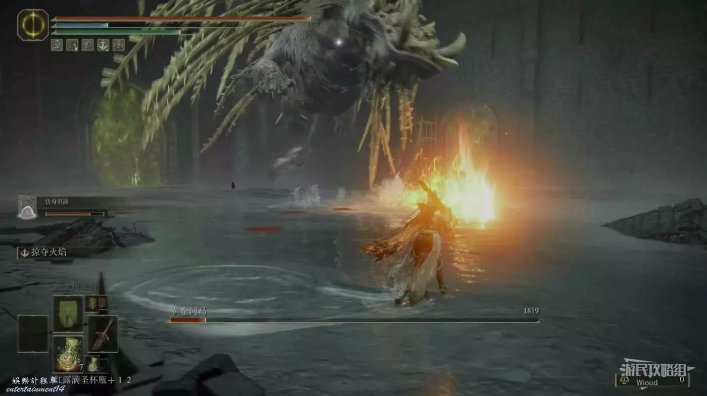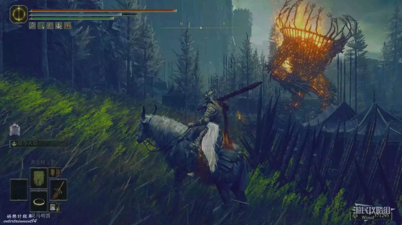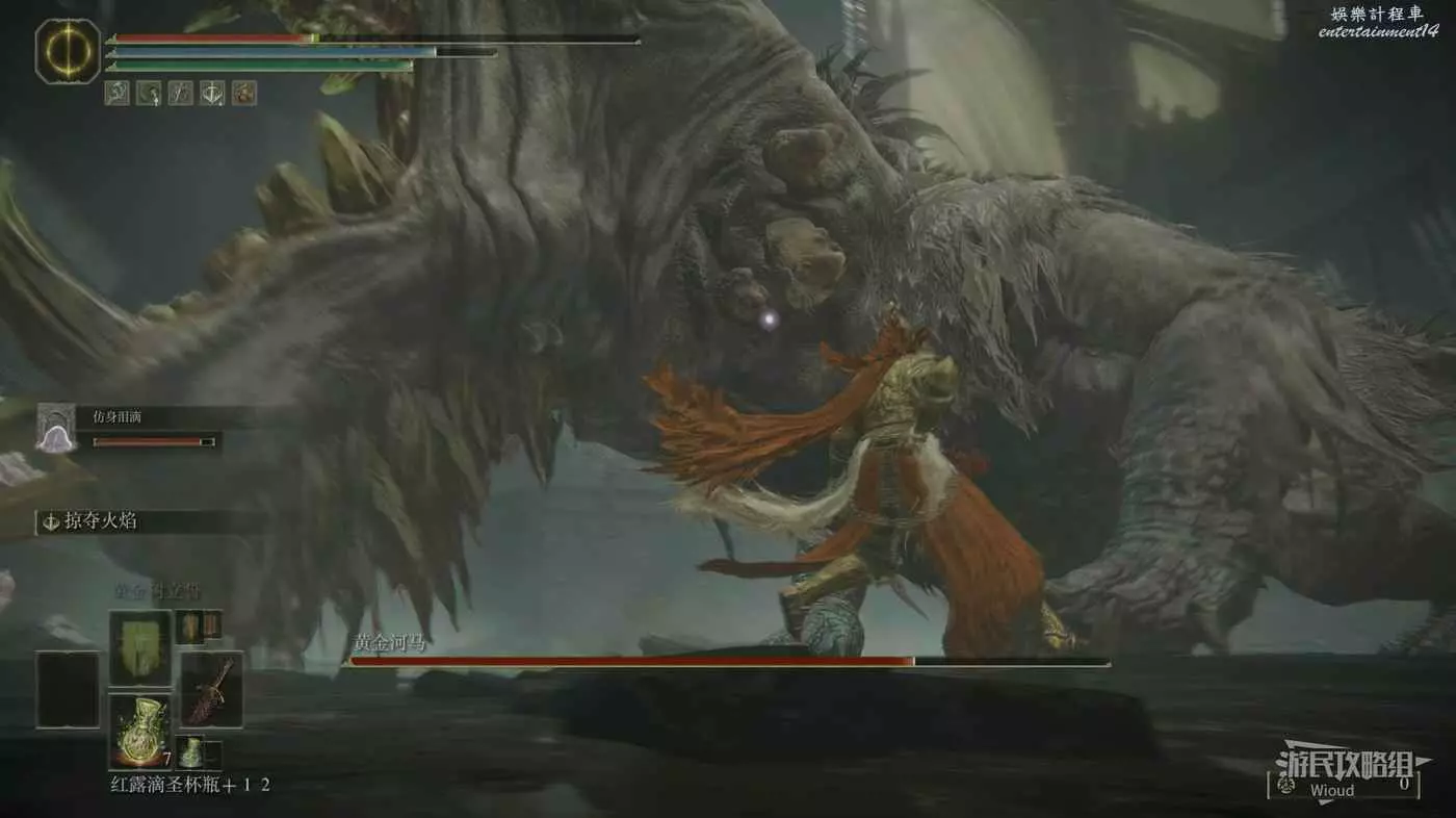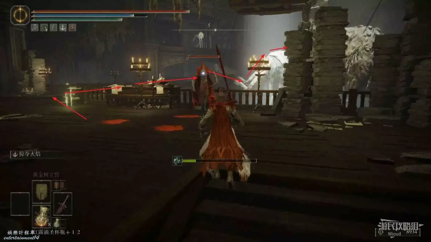 此處會出現一個入侵我們的“火焰騎士昆蘭”,它所使用的武器很長,因此不要誤判它的攻擊距離,總體來說難度不高,使用褻瀆聖劍的輪椅組合可以輕鬆擊敗。