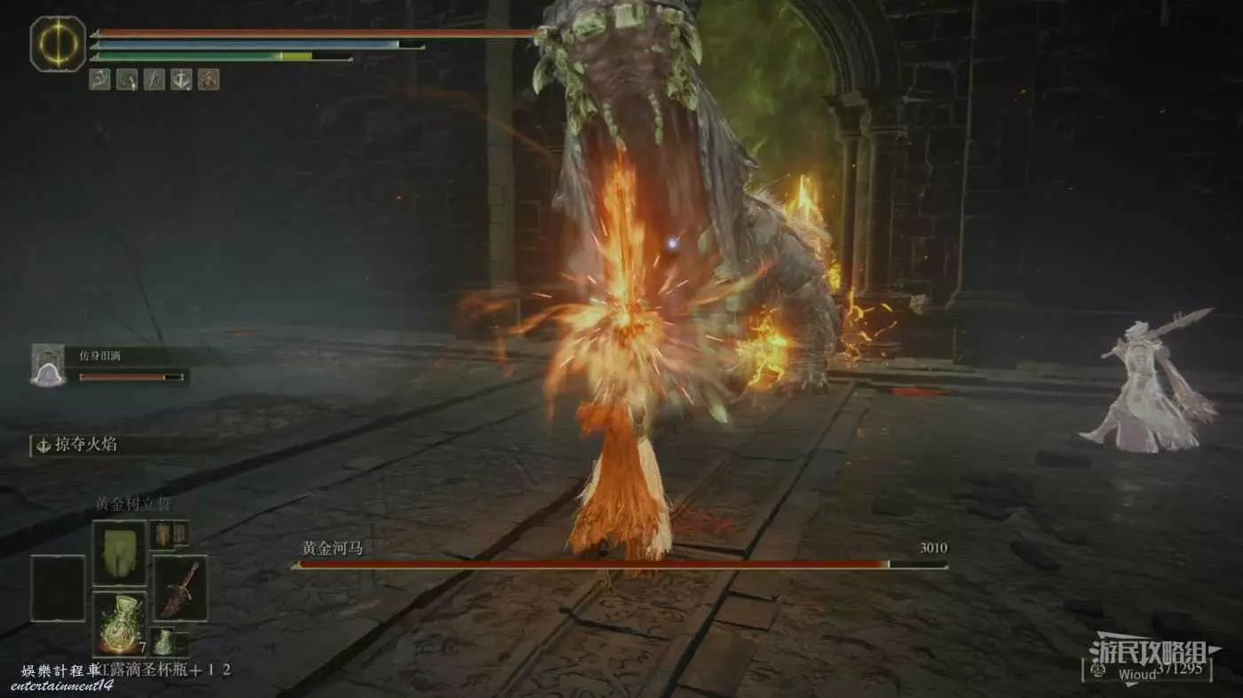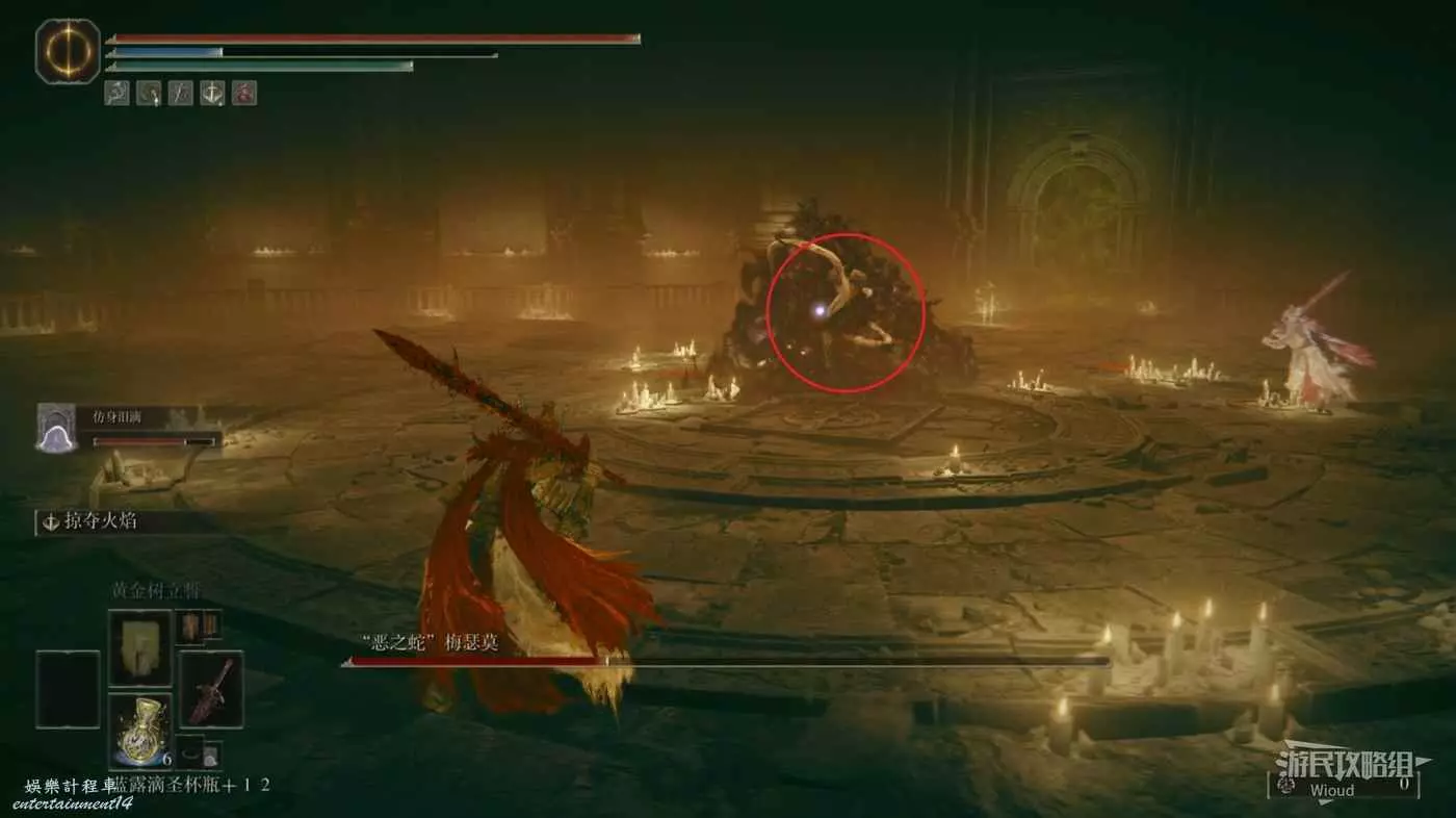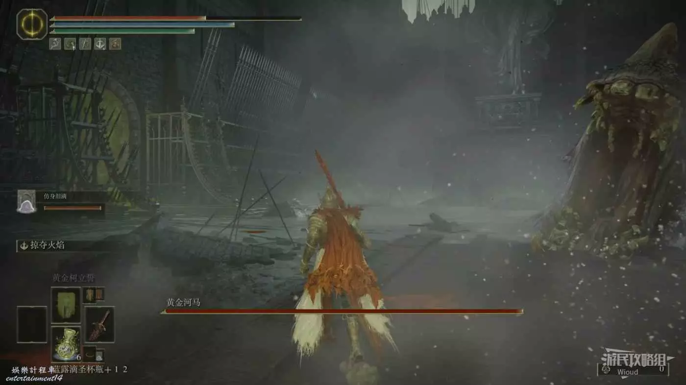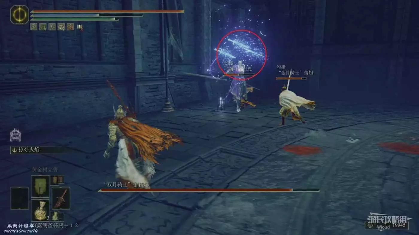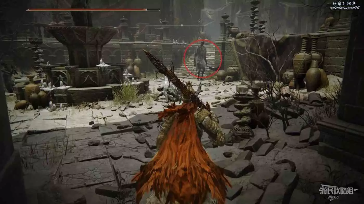 此處會出現一個入侵我們的“火焰騎士昆蘭”,它所使用的武器很長,因此不要誤判它的攻擊距離,總體來說難度不高,使用褻瀆聖劍的輪椅組合可以輕鬆擊敗。