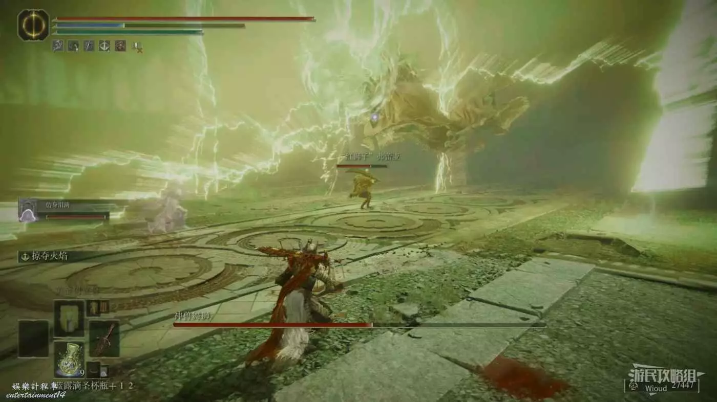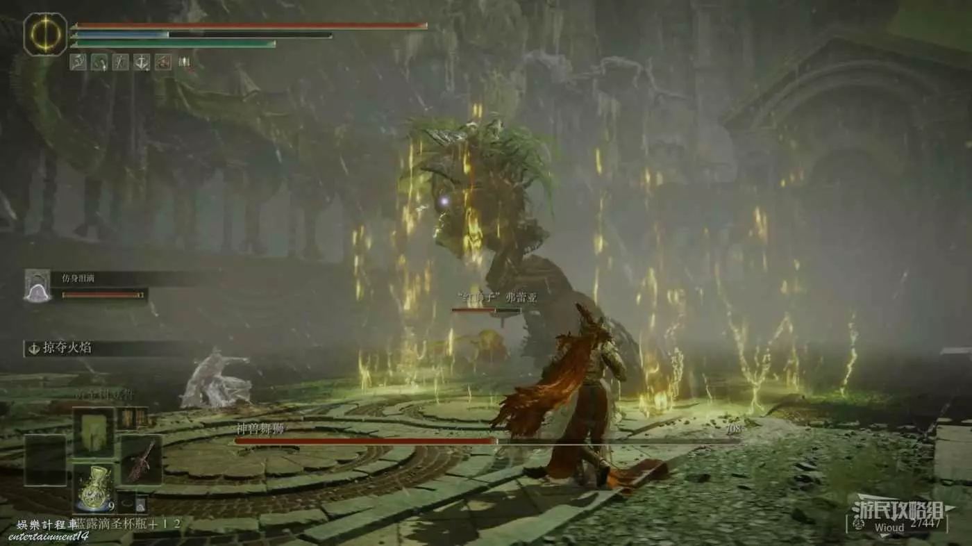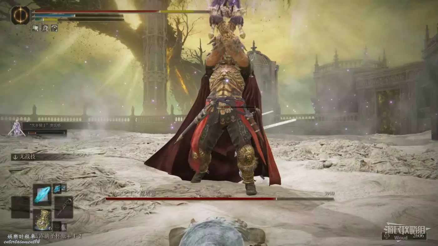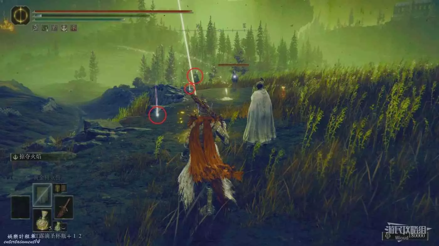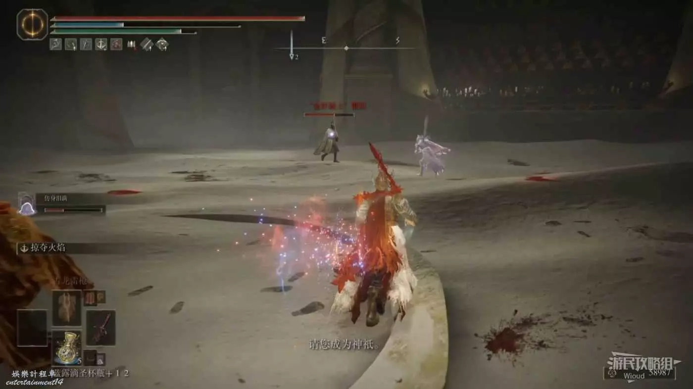 此處會出現一個入侵我們的“火焰騎士昆蘭”,它所使用的武器很長,因此不要誤判它的攻擊距離,總體來說難度不高,使用褻瀆聖劍的輪椅組合可以輕鬆擊敗。