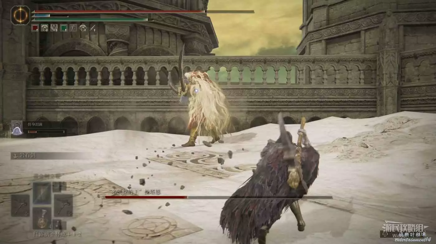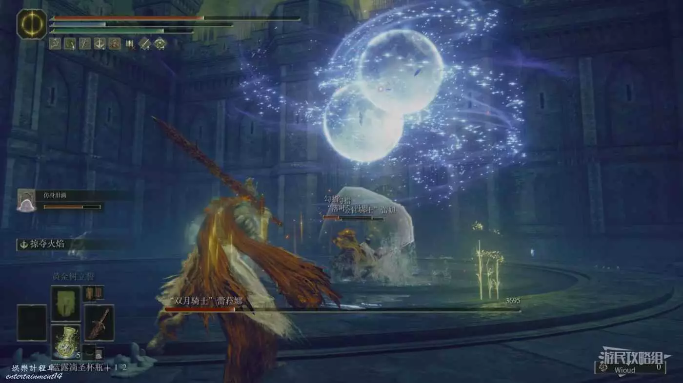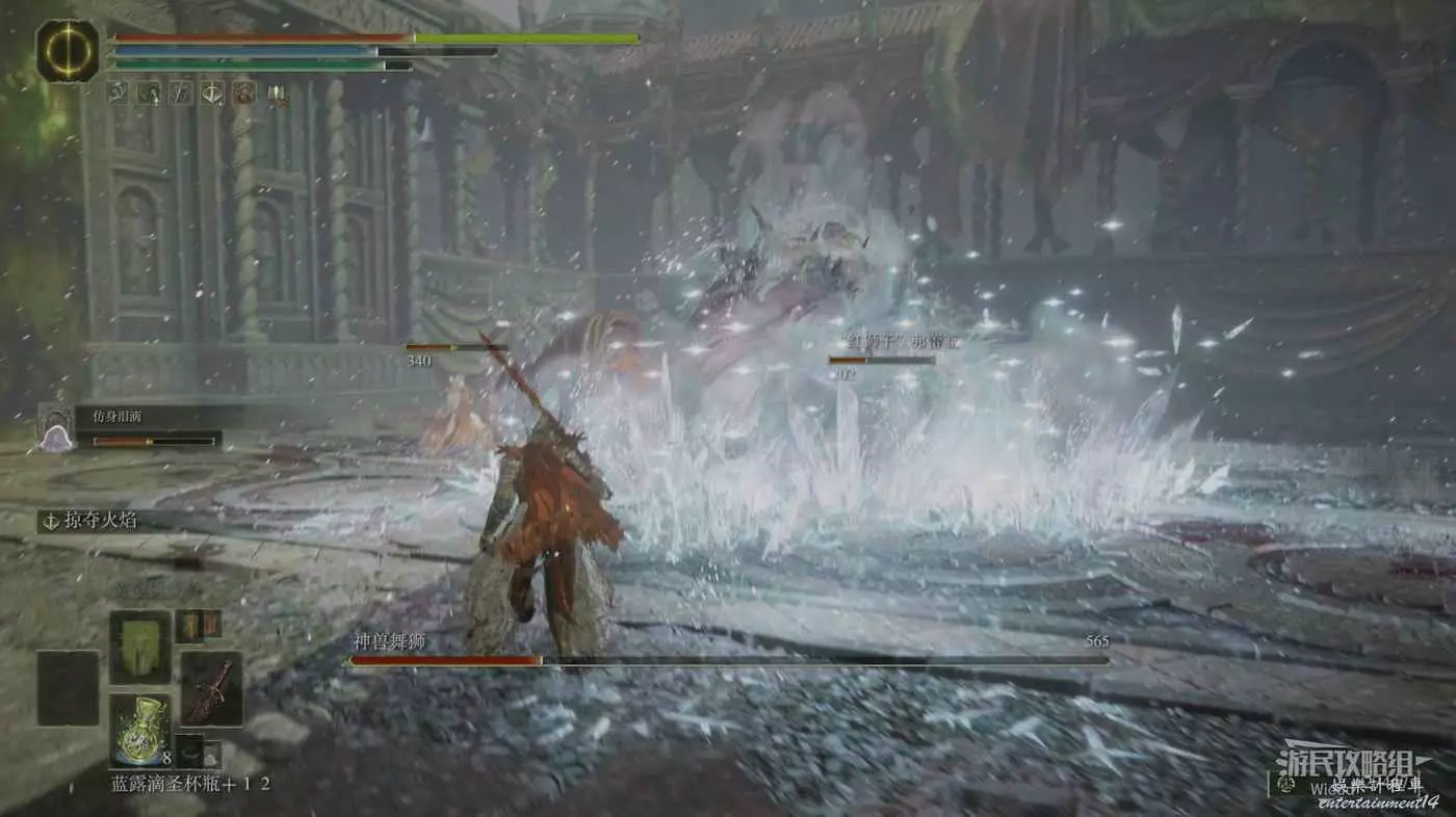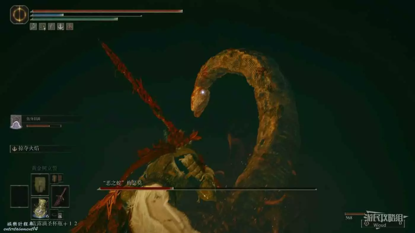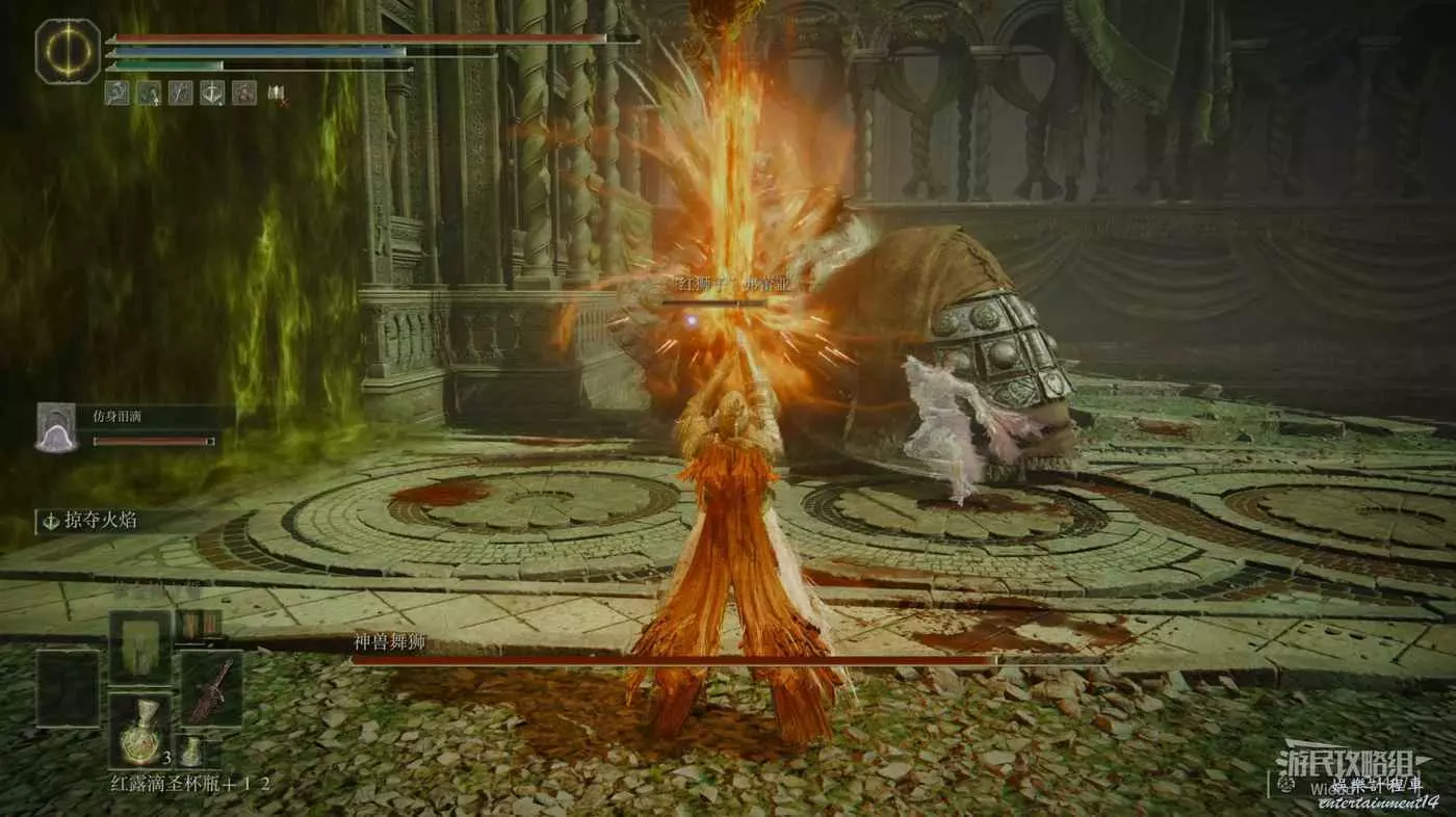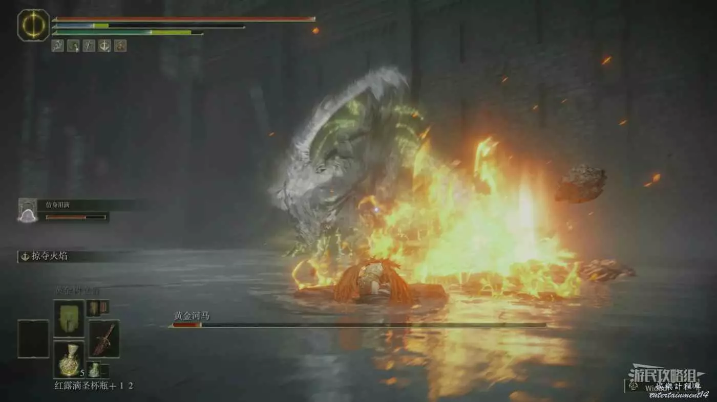 此處會出現一個入侵我們的“火焰騎士昆蘭”,它所使用的武器很長,因此不要誤判它的攻擊距離,總體來說難度不高,使用褻瀆聖劍的輪椅組合可以輕鬆擊敗。