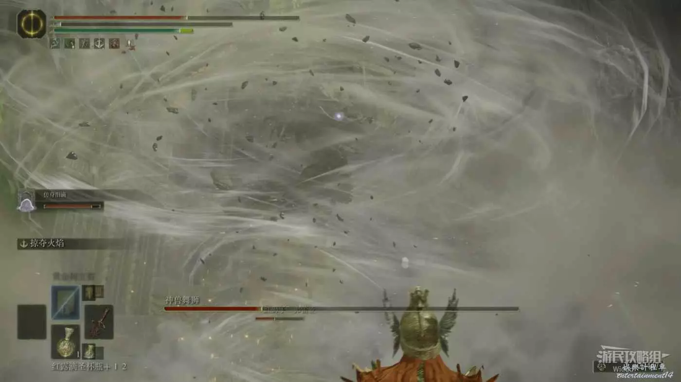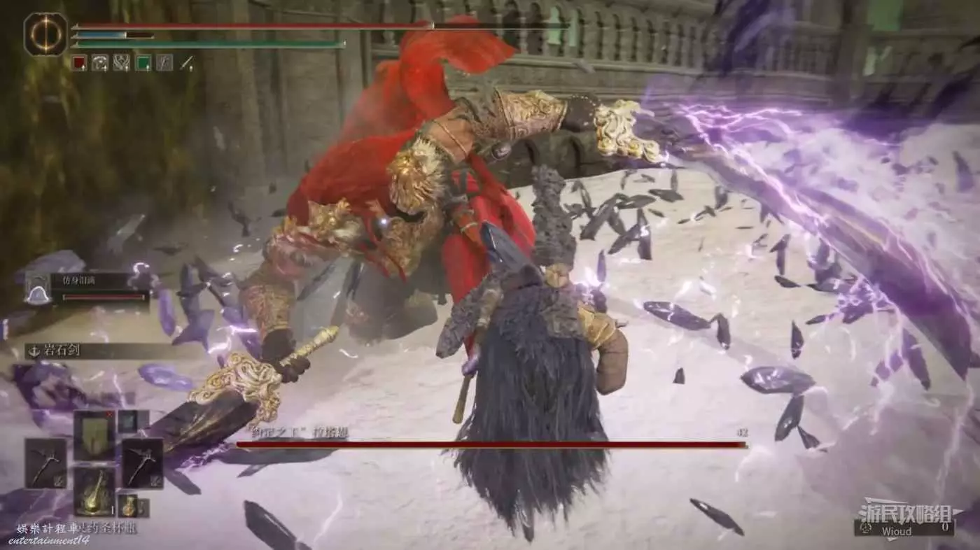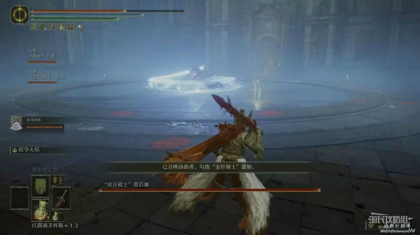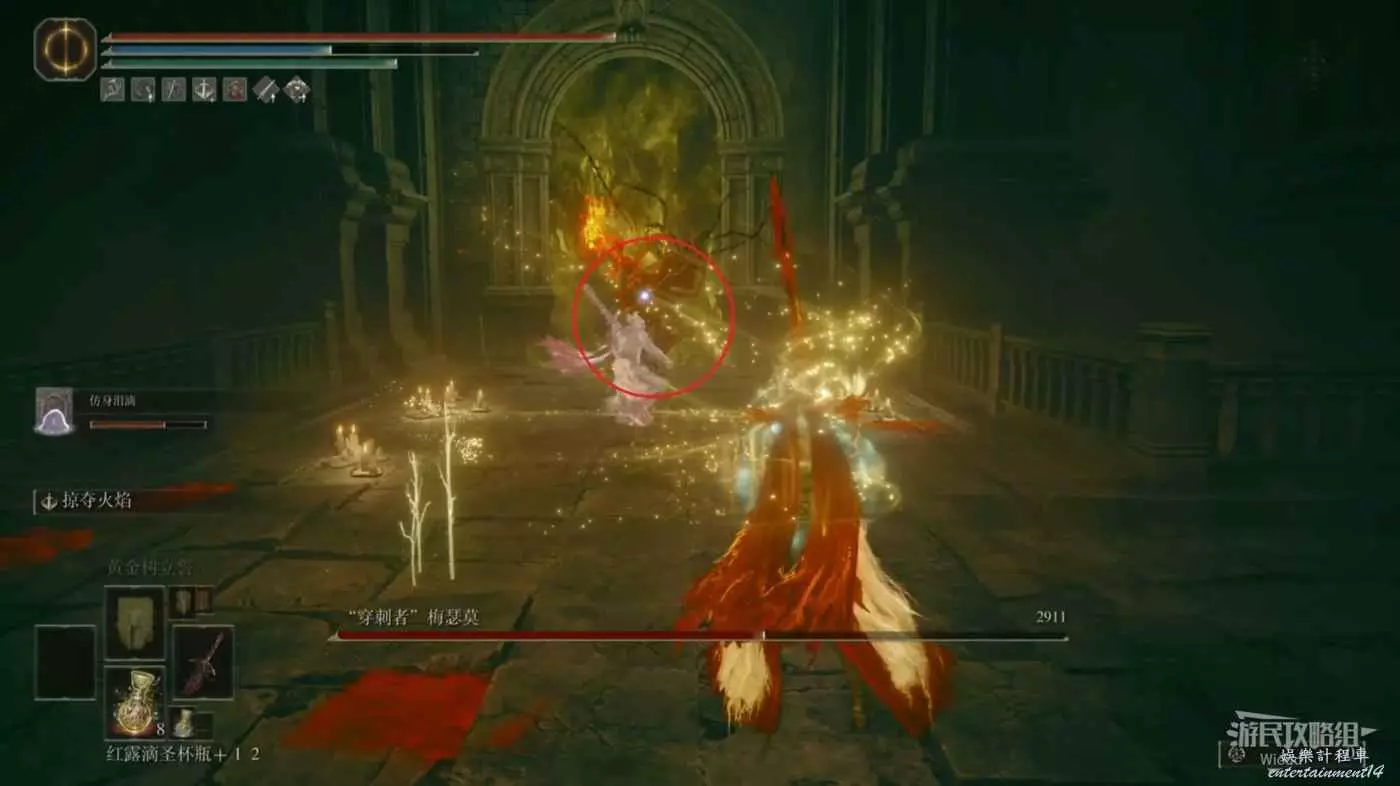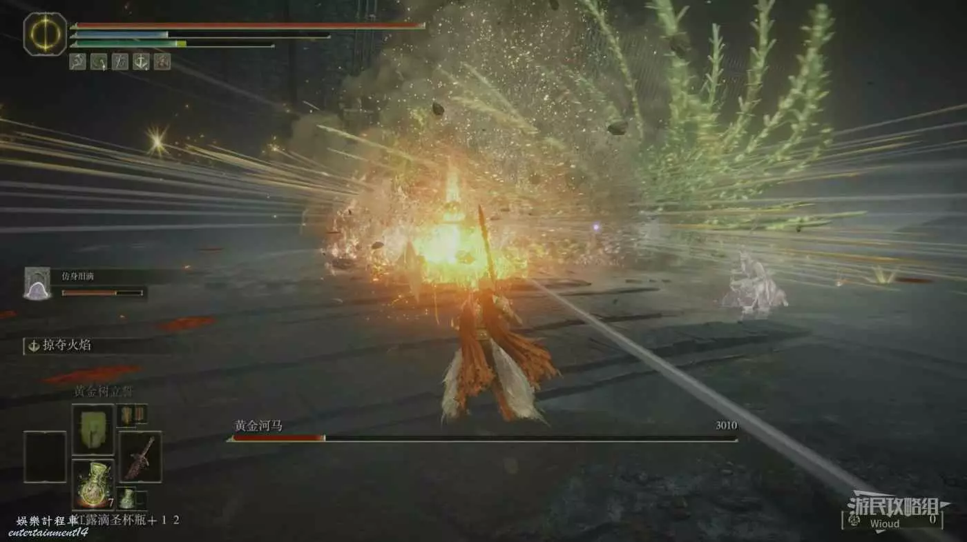此處會出現一個入侵我們的“火焰騎士昆蘭”,它所使用的武器很長,因此不要誤判它的攻擊距離,總體來說難度不高,使用褻瀆聖劍的輪椅組合可以輕鬆擊敗。
