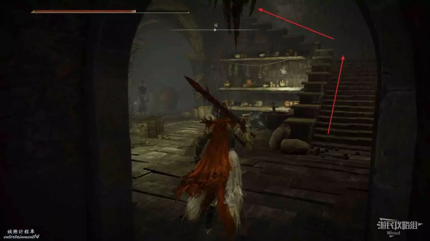 擊敗此處的敵人往左前方走,可以看到一個房間的入口,進入房間爬梯子到2樓。