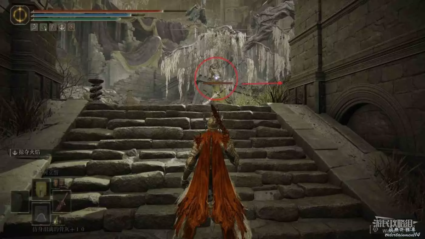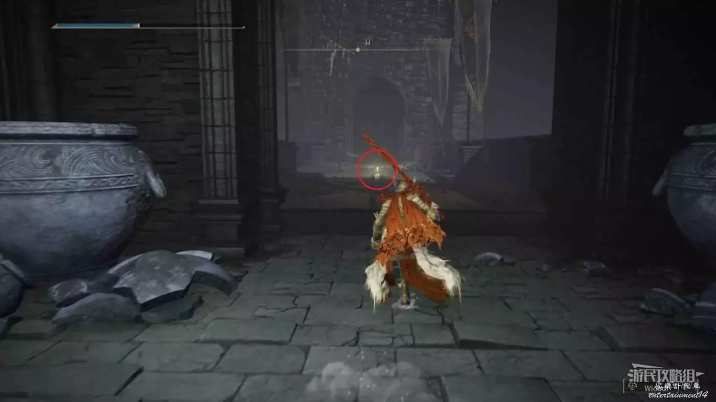 枯樹旁邊的雕像處可以獲得一個【靈灰】,拾取後繼續沿著路走到盡頭,進入建築。