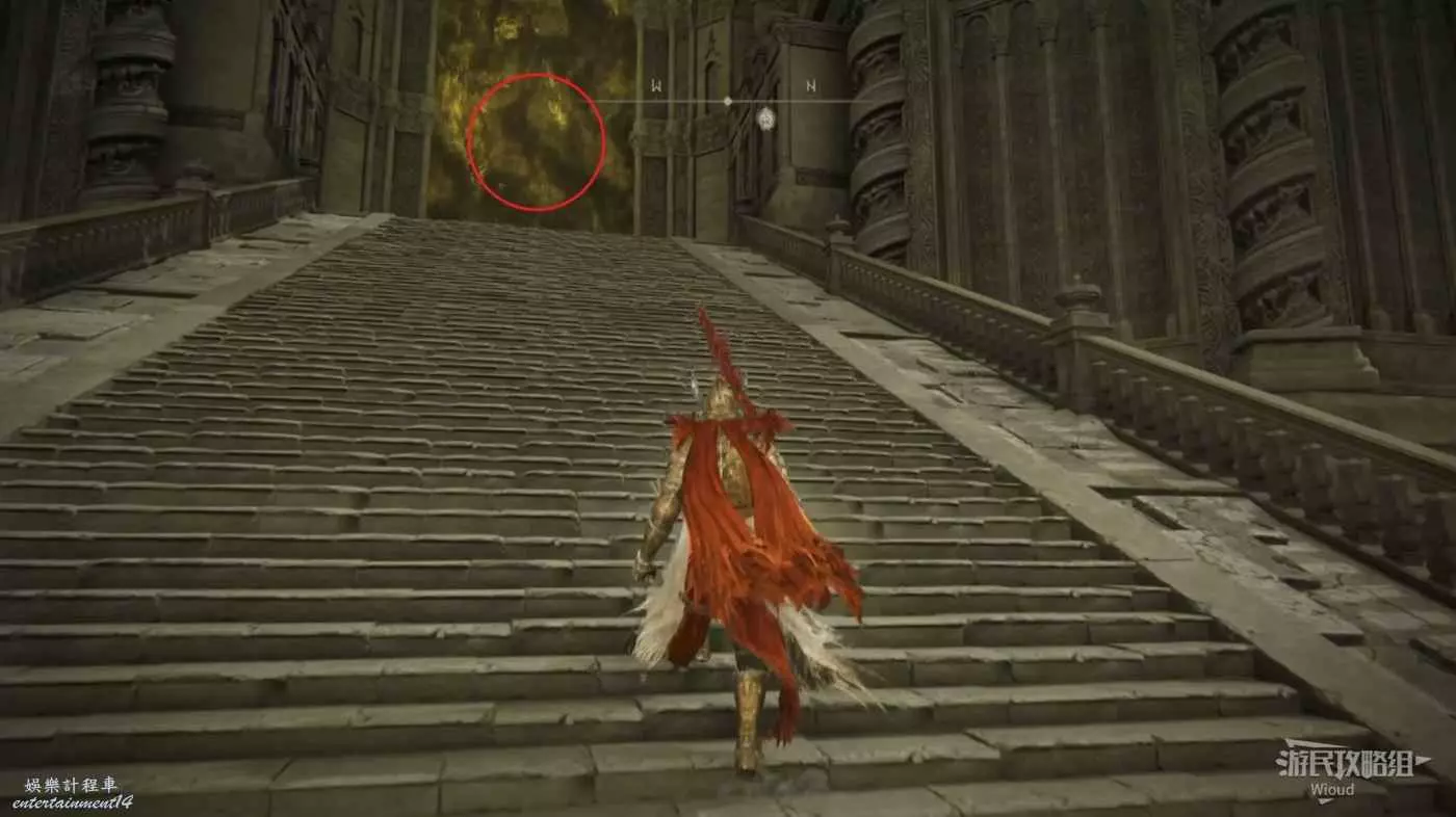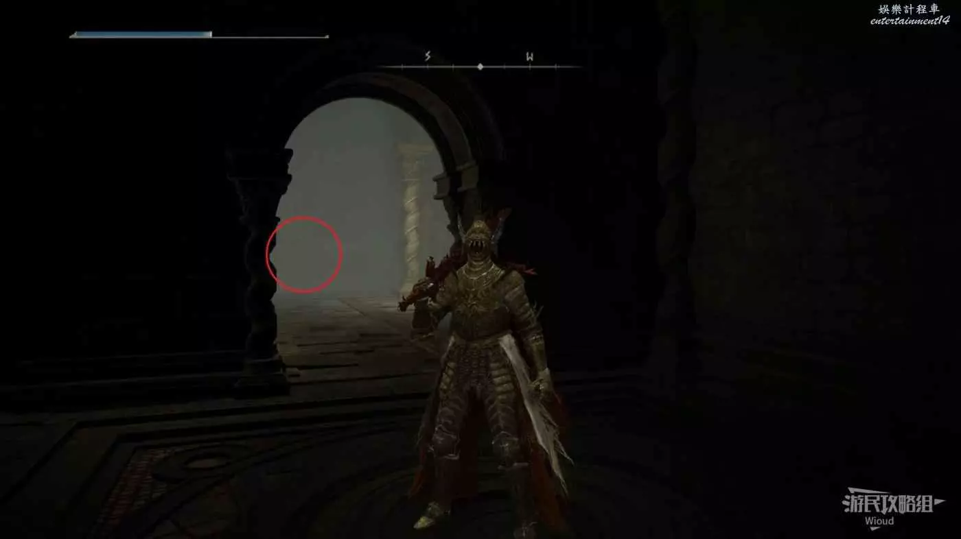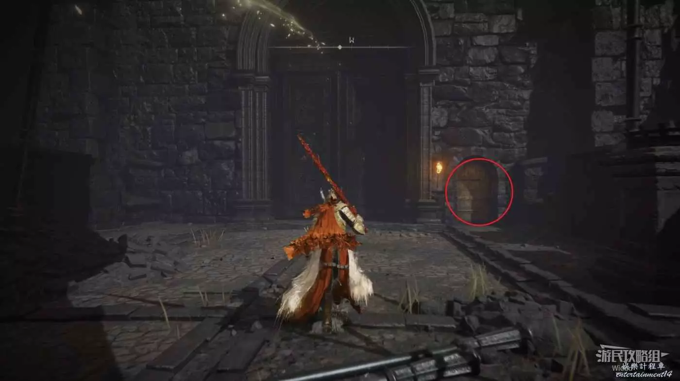 從賜福點出發沿路一直走就能看到盡頭右側的遺跡入口,進入遺跡先直走到盡頭,再往右走就能看到大門。