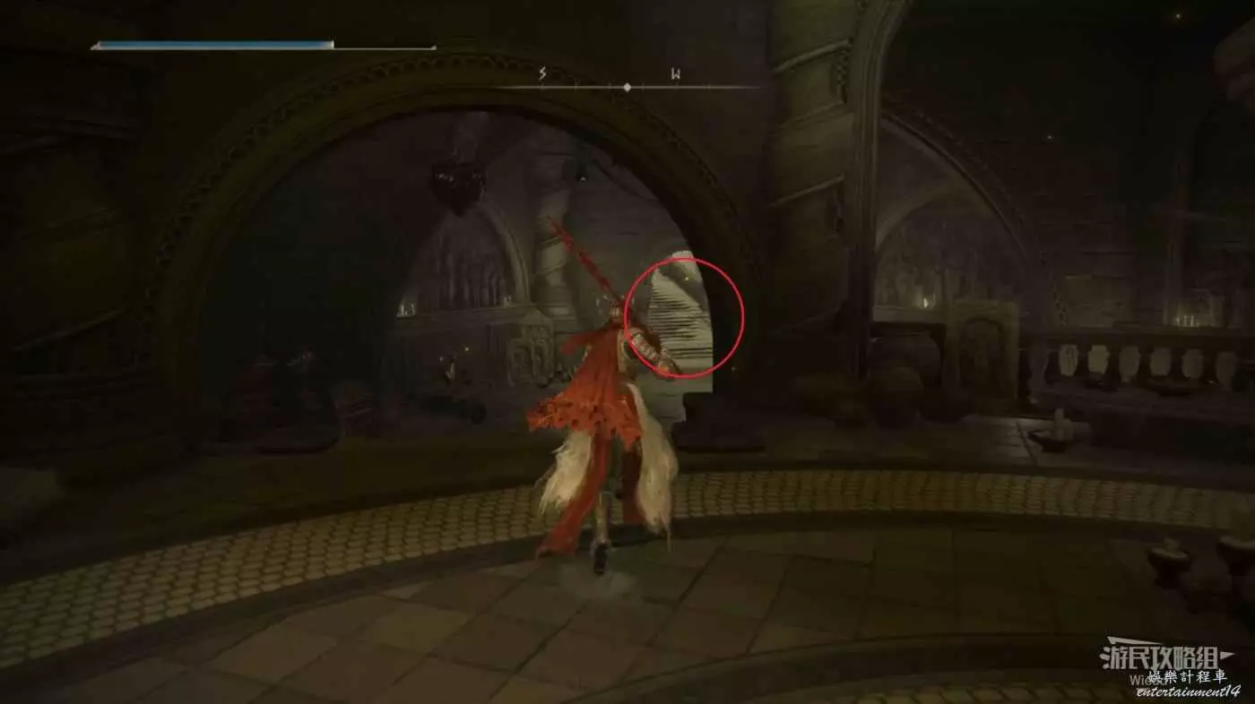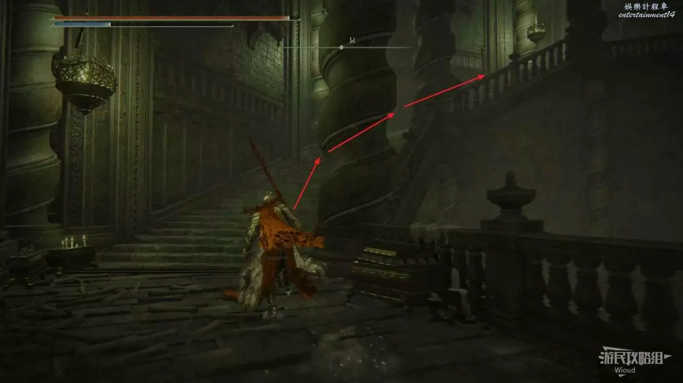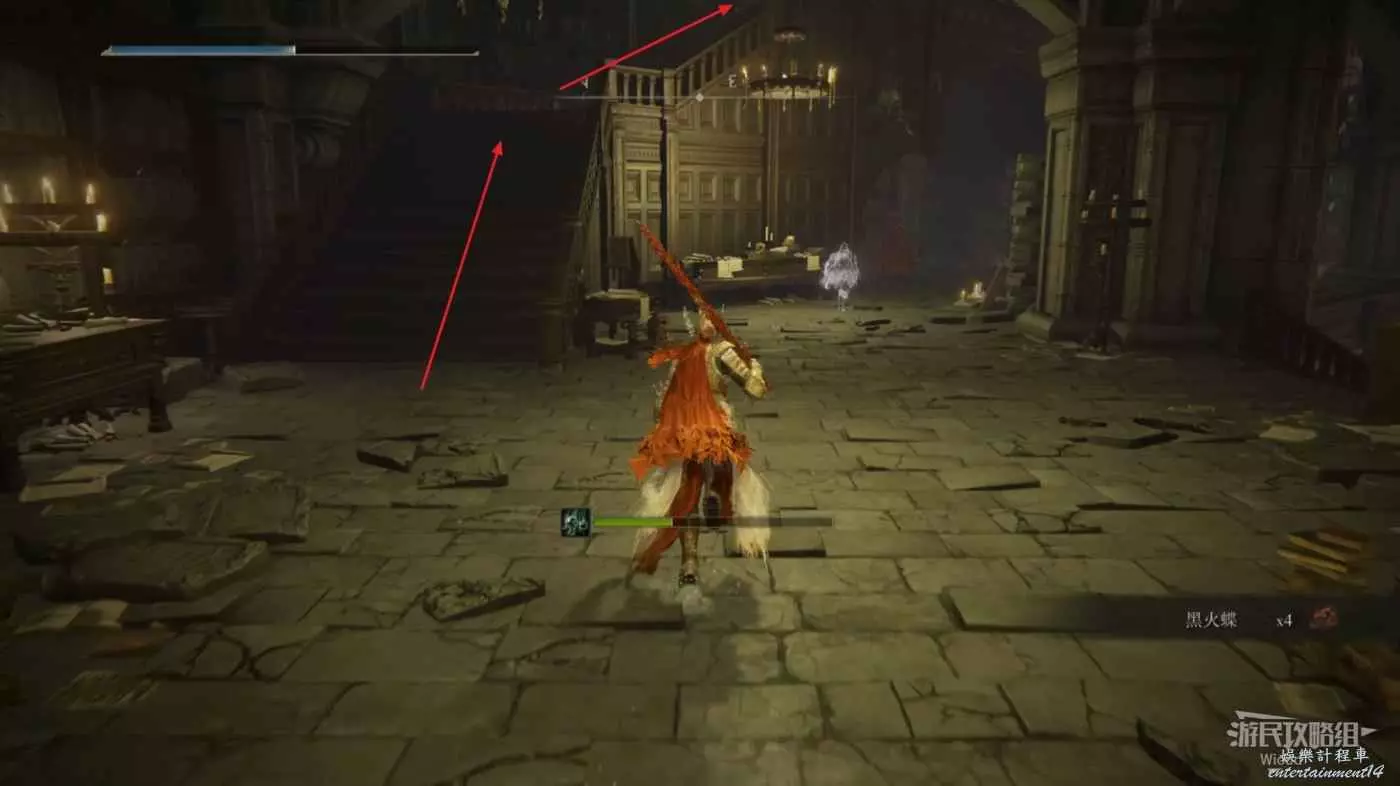 上樓梯前左側有一個【靈灰】可以獲取,接著沿樓梯走到一半跳到下方的樓梯上面。