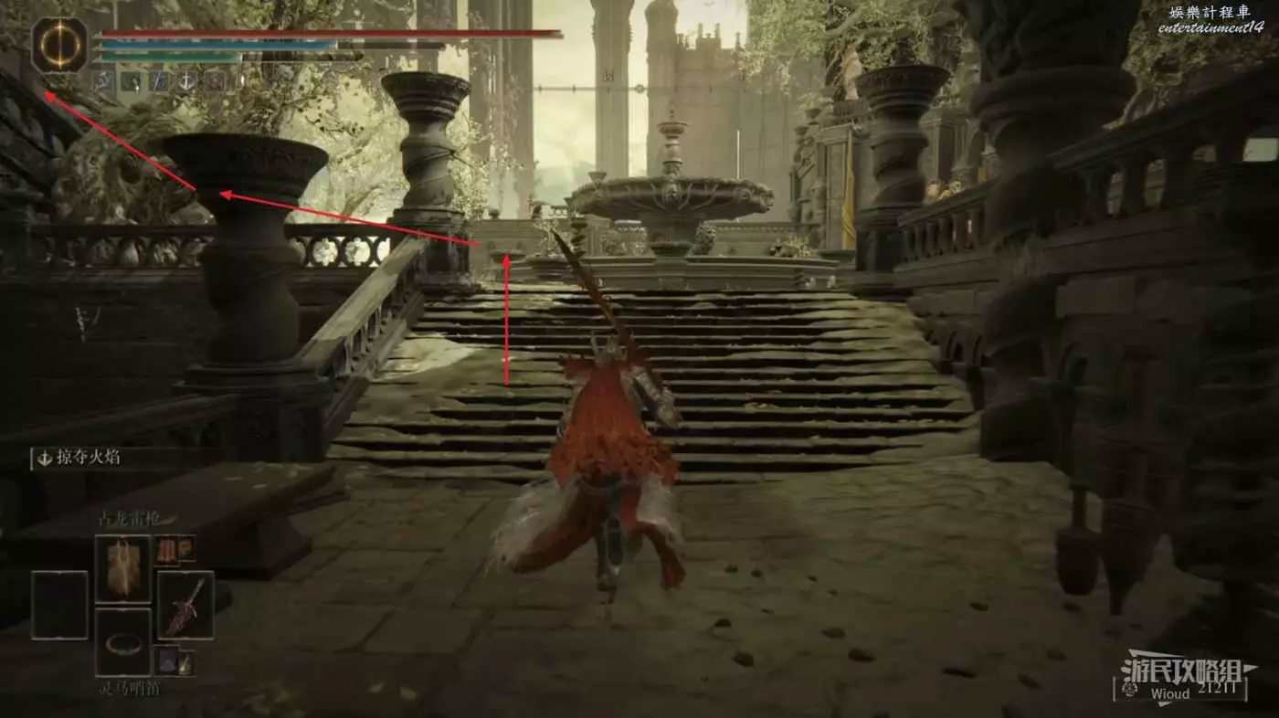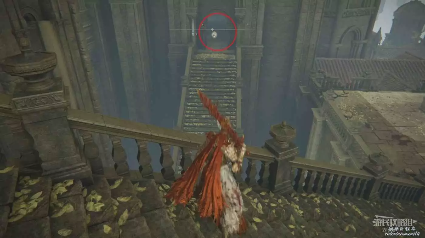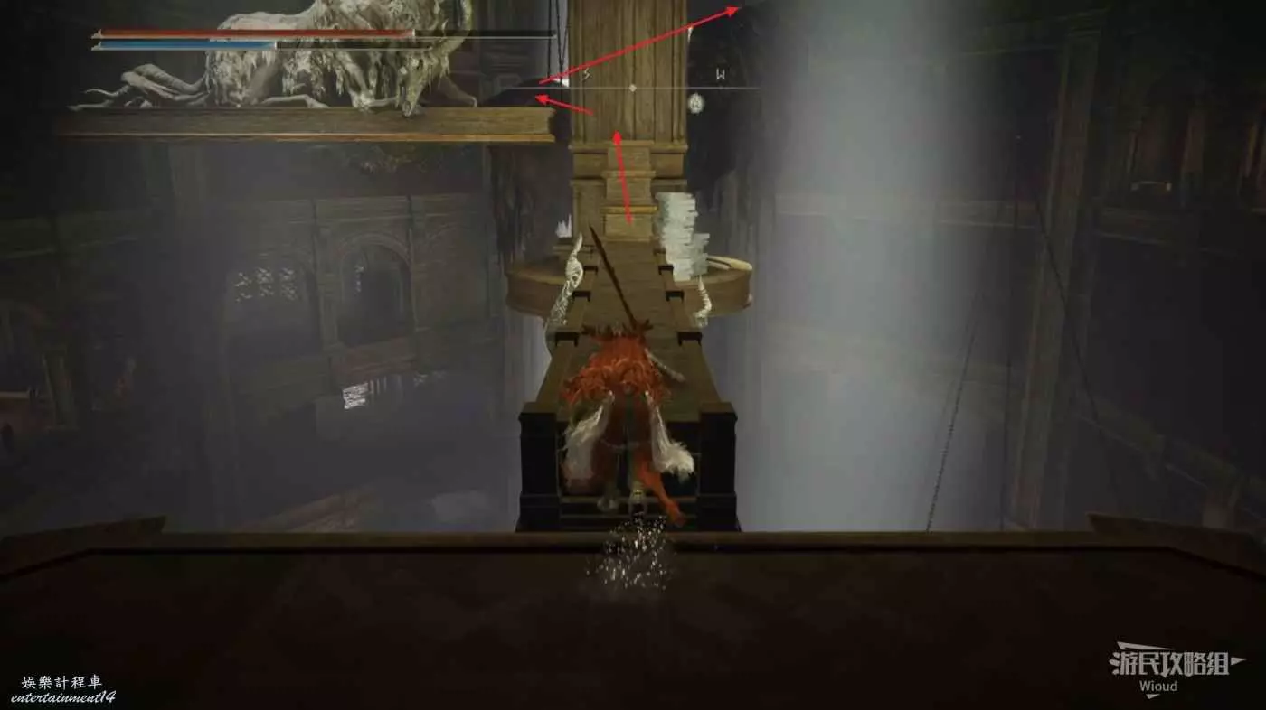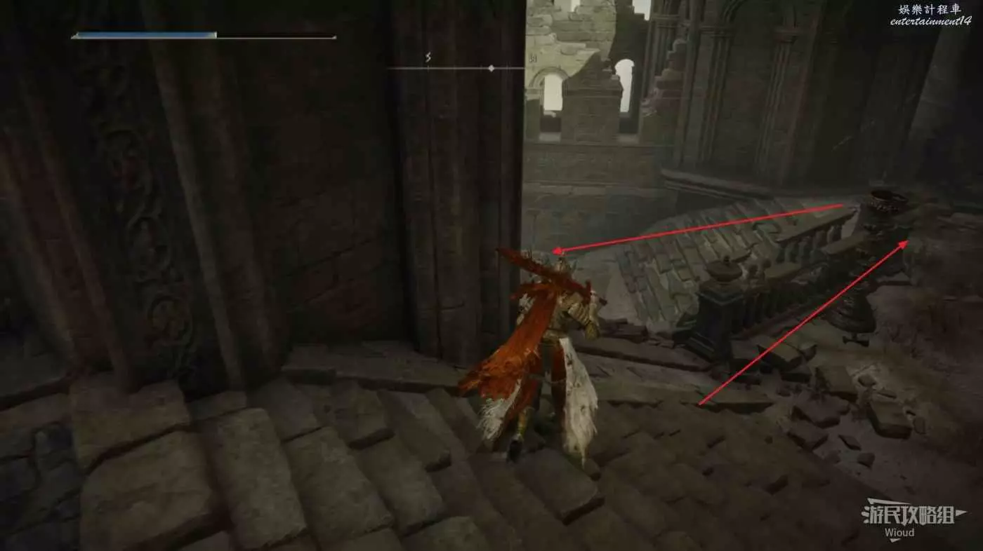 上樓梯前左側有一個【靈灰】可以獲取,接著沿樓梯走到一半跳到下方的樓梯上面。