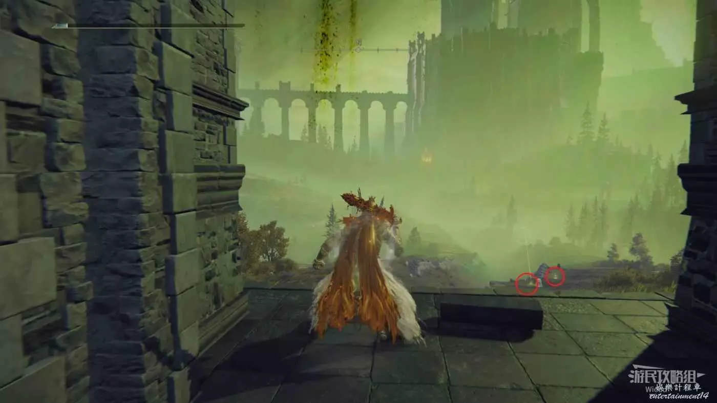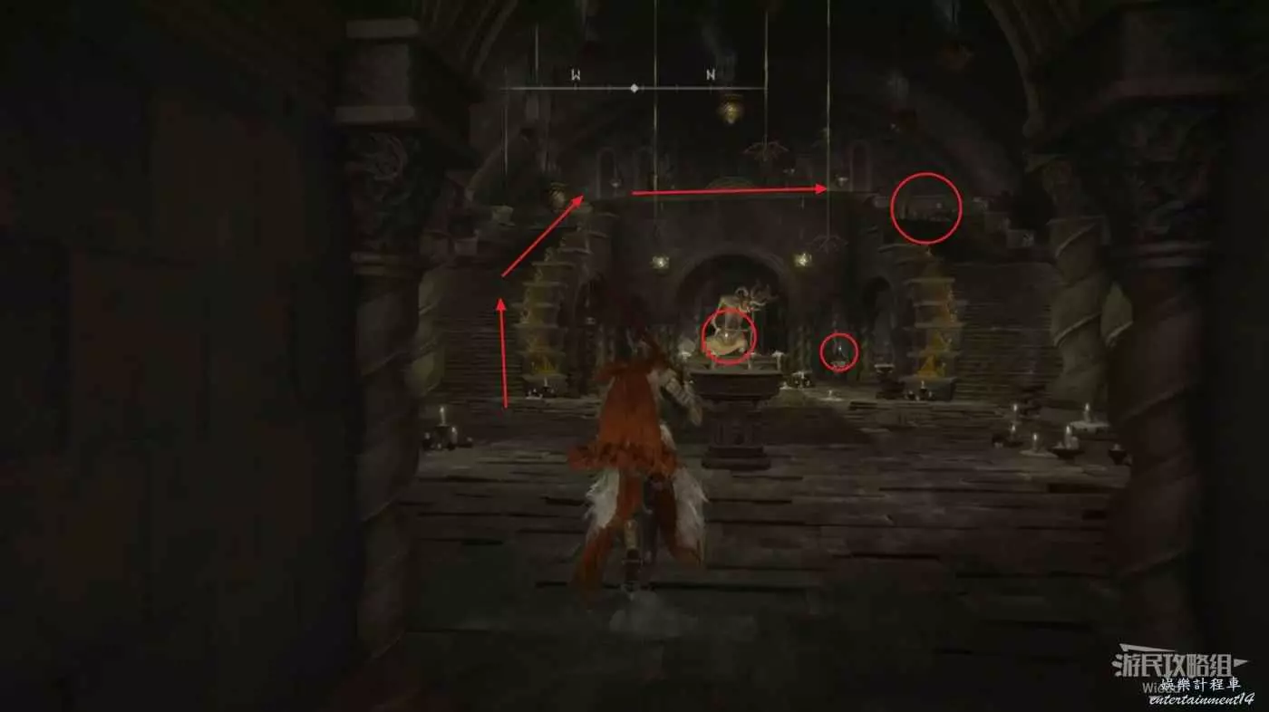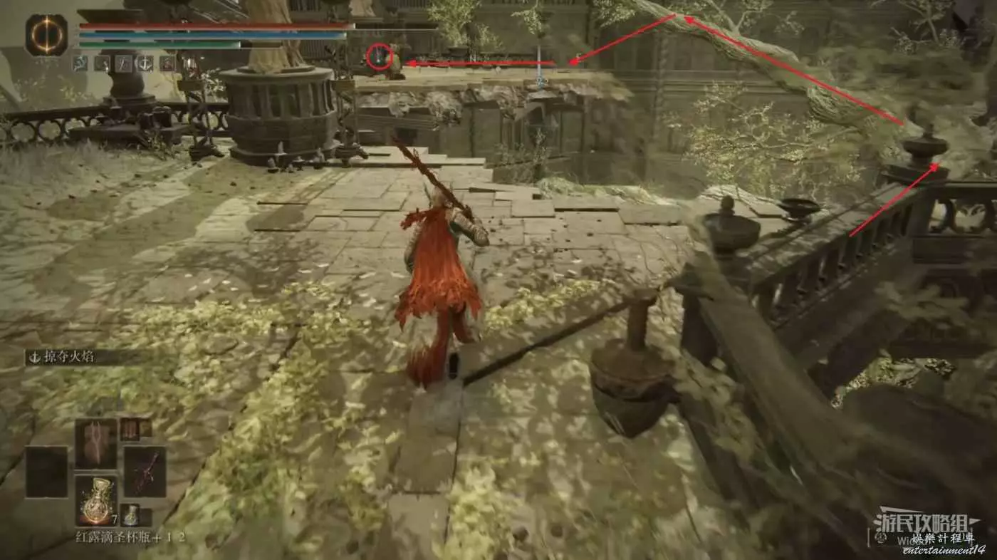 然後從賜福點出發,按照下圖所示路線順著右前方的石橋走