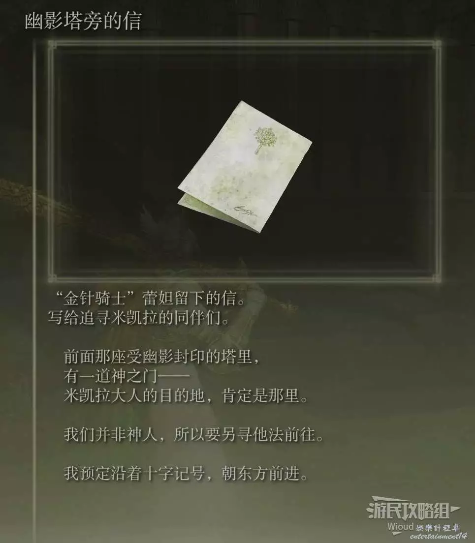 達到終點調查擋路的樹枝,拾取大門右側的道具獲得【幽影塔旁的信】在背包裡閱讀。