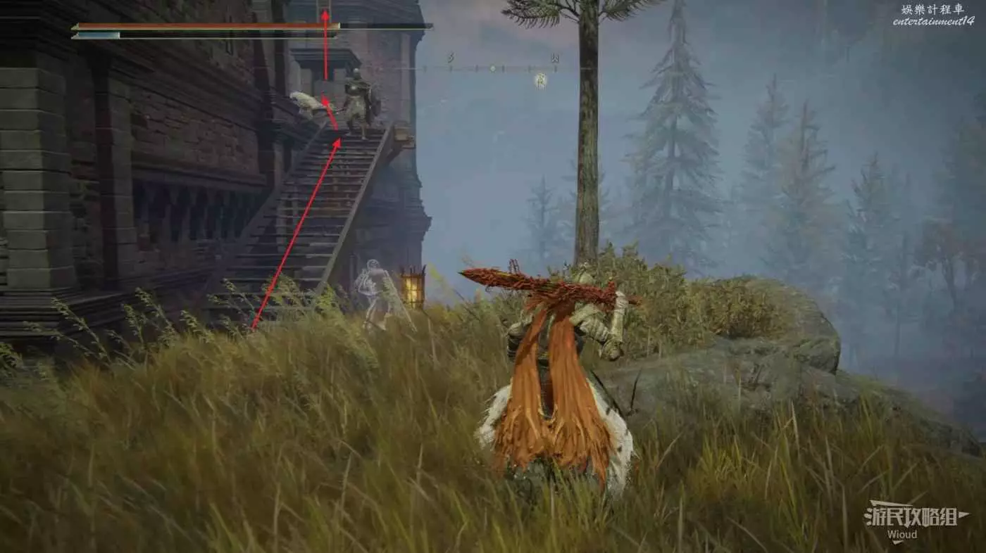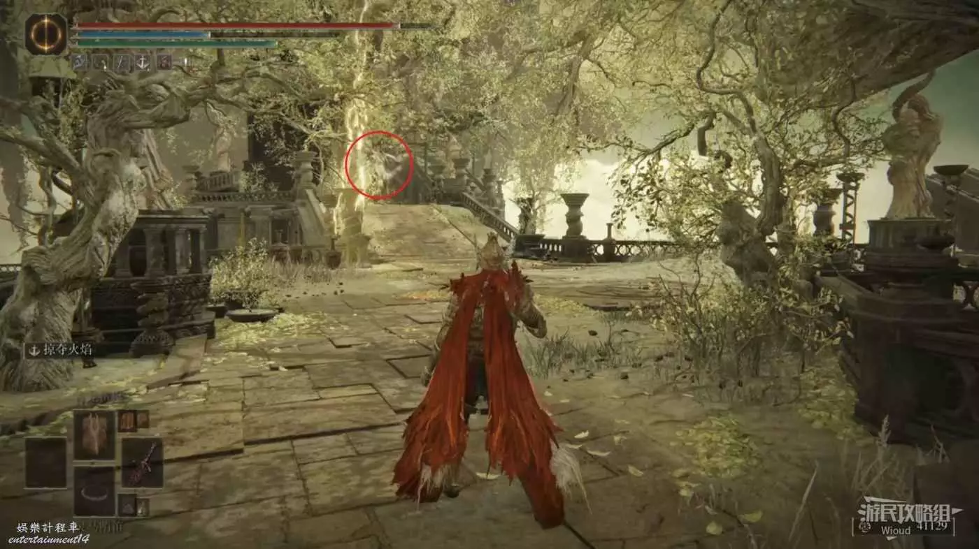 離開2樓房間不要管左側的敵人,徑直往前走,到達前方枯樹的位置停下。