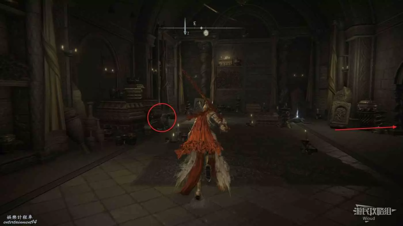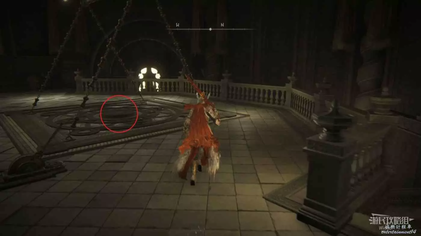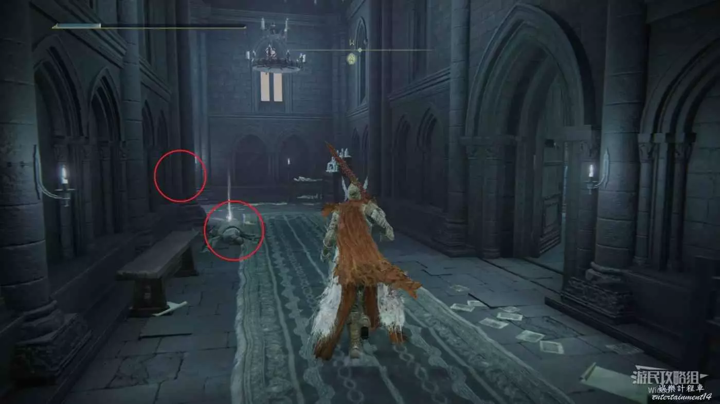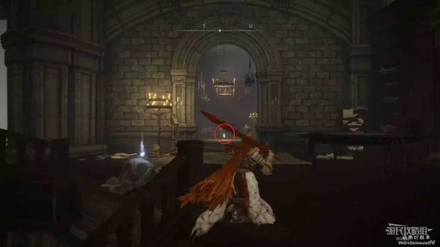 隨後回到城堡門前,此處有大門和小門兩個入口,從哪進入都一樣,走到城堡一個類似教堂的建築後拾取前方的道具可以獲得護符【蕾菈娜的浮雕墜飾】。