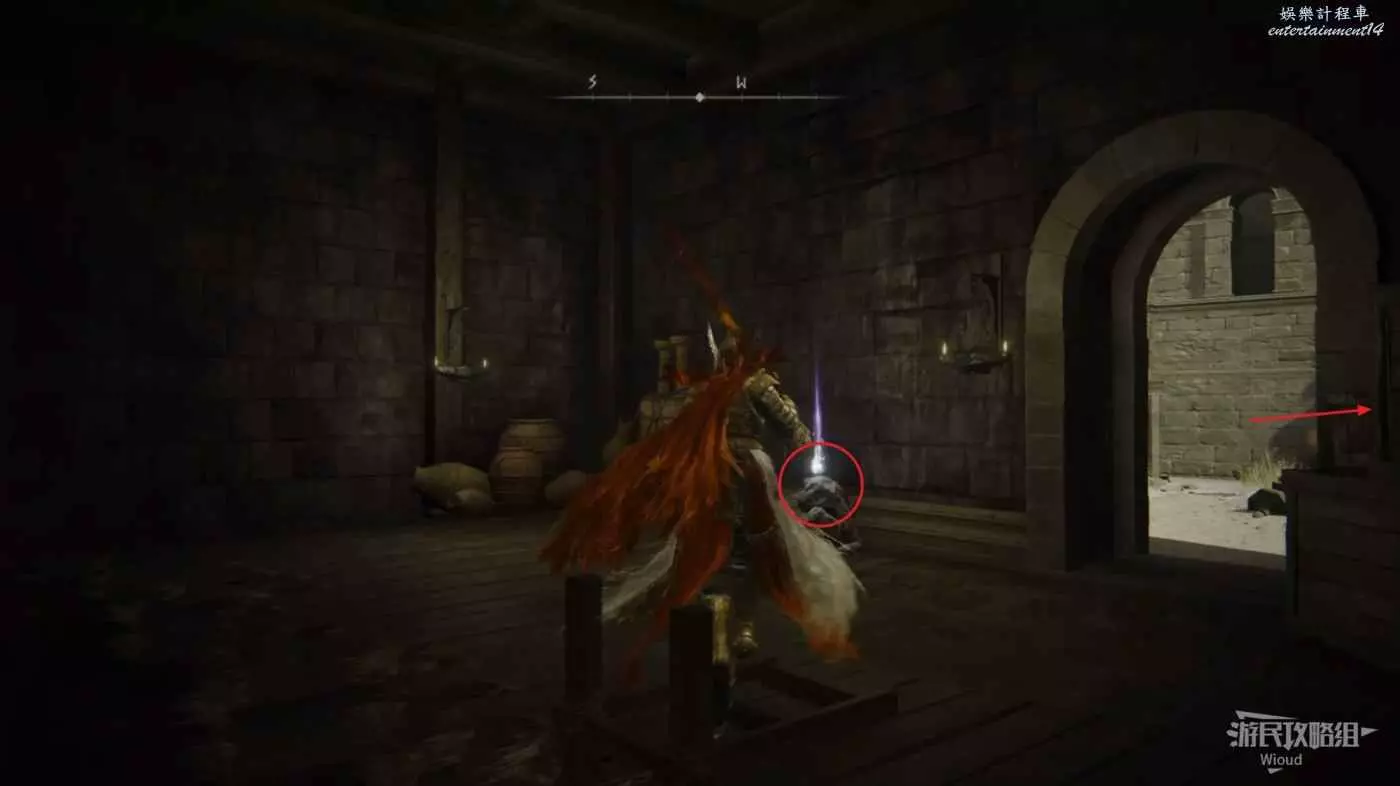 入口沿著土坡進入左前方的入口,上樓梯之前打碎樓梯右側的罐子,可以拾取到一個盧恩。