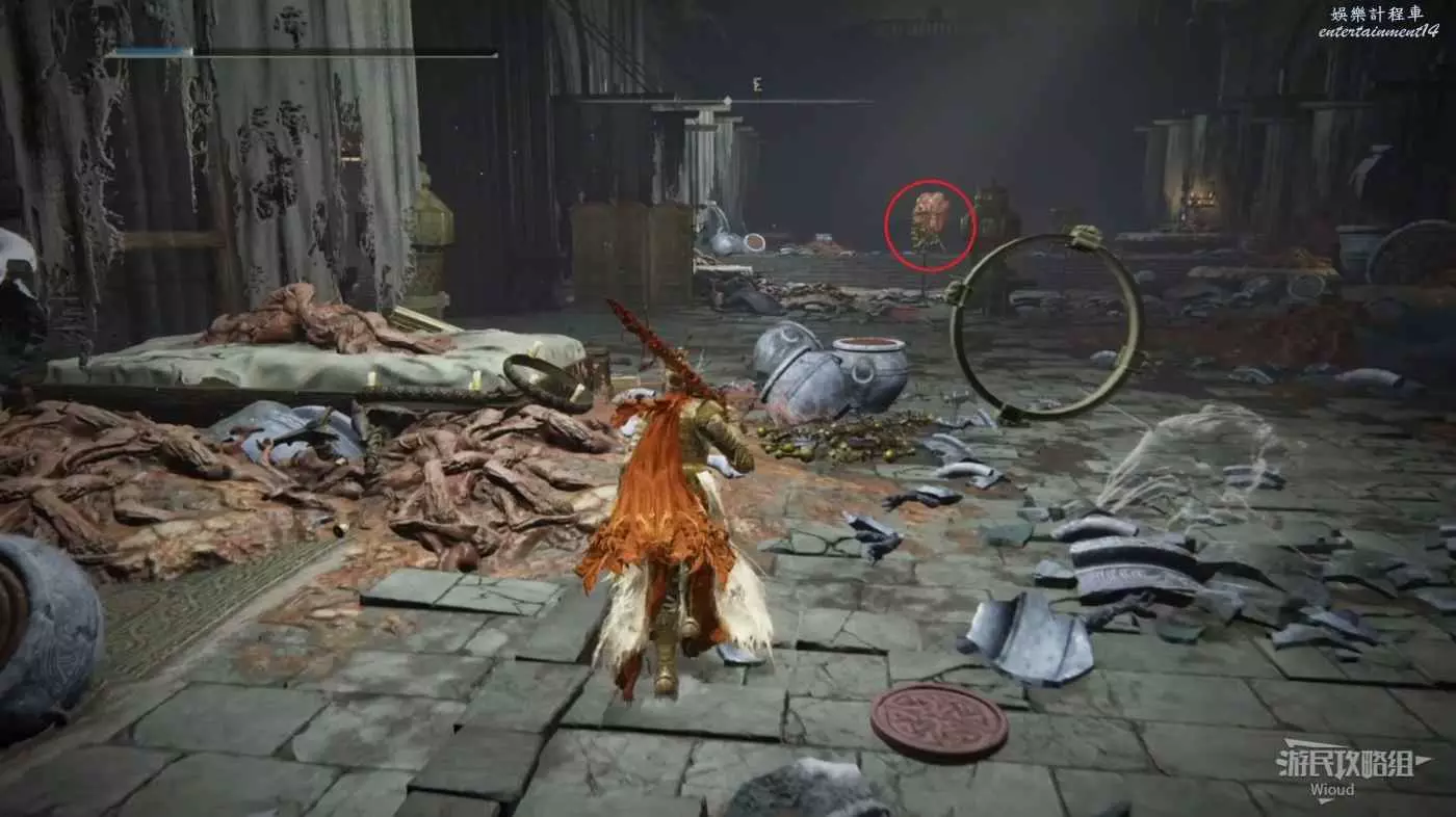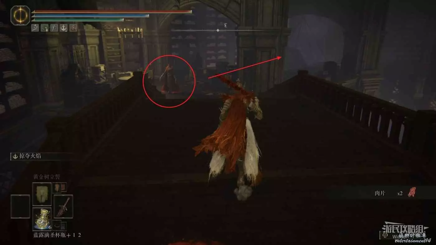 左側區域正前方的屍體可以拾取一個【附繩王室魔力油脂】,接著爬左側的樓梯進入某個2樓房間內,裡面有兩個敵人。