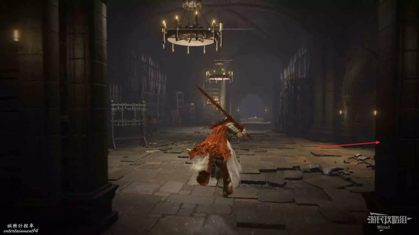 繼續沿著走廊走到盡頭左拐,前方有兩個入口,攻擊左邊的牆即可進入隱藏區域,裡面可以撿到戰場神父的製作筆記4,然後我們沿著右側樓梯往下走。