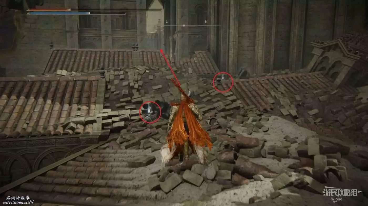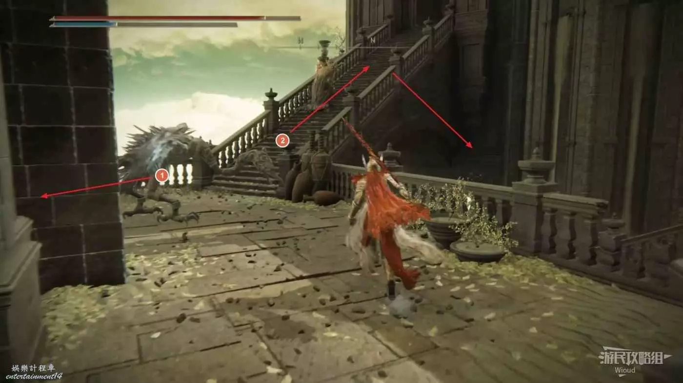 走出房間就會遇到一個拿著雙大刀的敵人,它的連招速度很快且次數很多,注意不要被卡在樓梯上直接被秒,擊敗敵人直接往右走,經過一段廢墟會到達一個較大的區域。