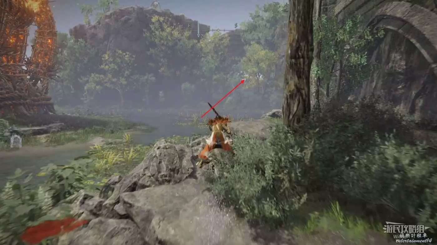 然後往前方右側走,騎馬跳到樹上拾取樹上的光點可以獲得【熔爐薄翼護符】。