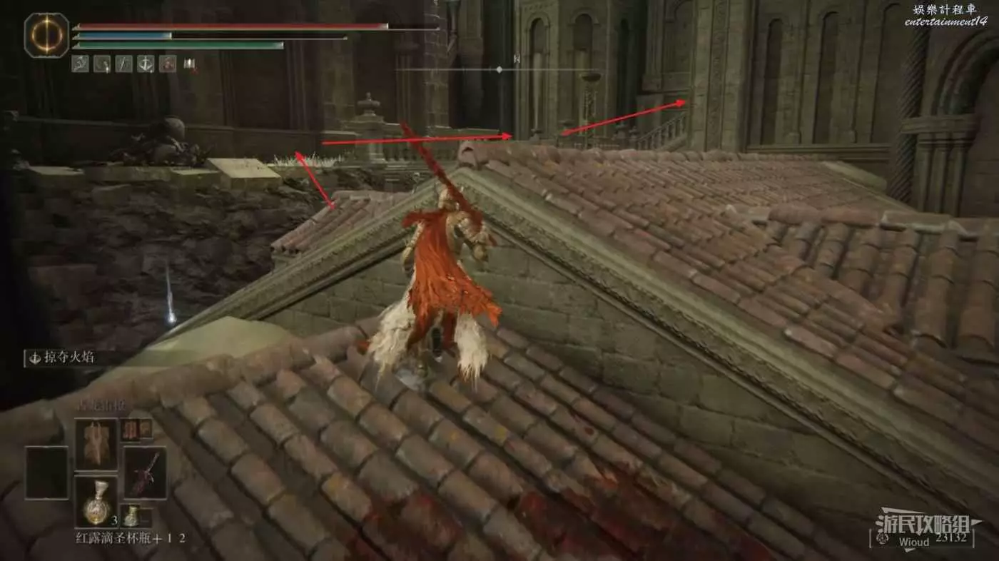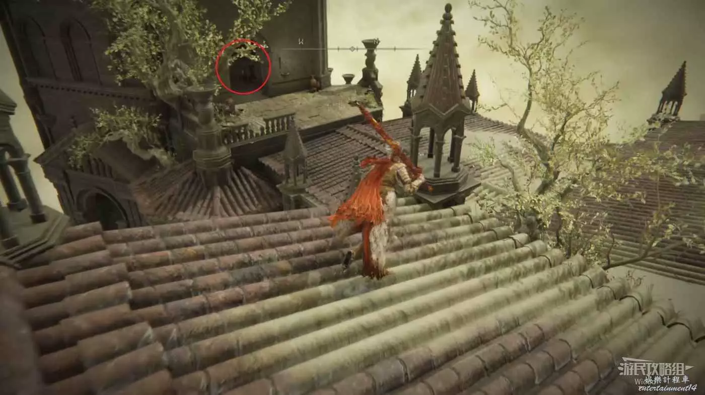 完事往右側屋頂走,順著屋頂的斜面走到前方的窗戶位置,沿著樓梯繼續往上爬。