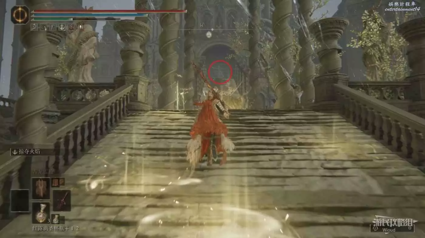 回到剛才的戰鬥的位置繼續沿著樓梯往上走,此時會遇到一個魔法老登施法阻礙我們,直接跑過去不會受到傷害,可管可不管,隨後打開前方的大門,啟動裡面的賜福,並再次找到一個十字記號。