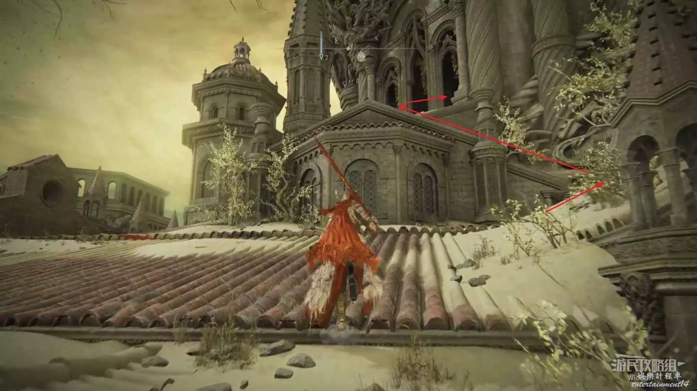 回到房間的入口,直接跳到右側坍塌房屋的上面,可以直接看到右下方有一個房間的入口。
