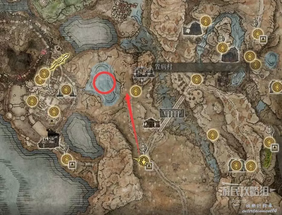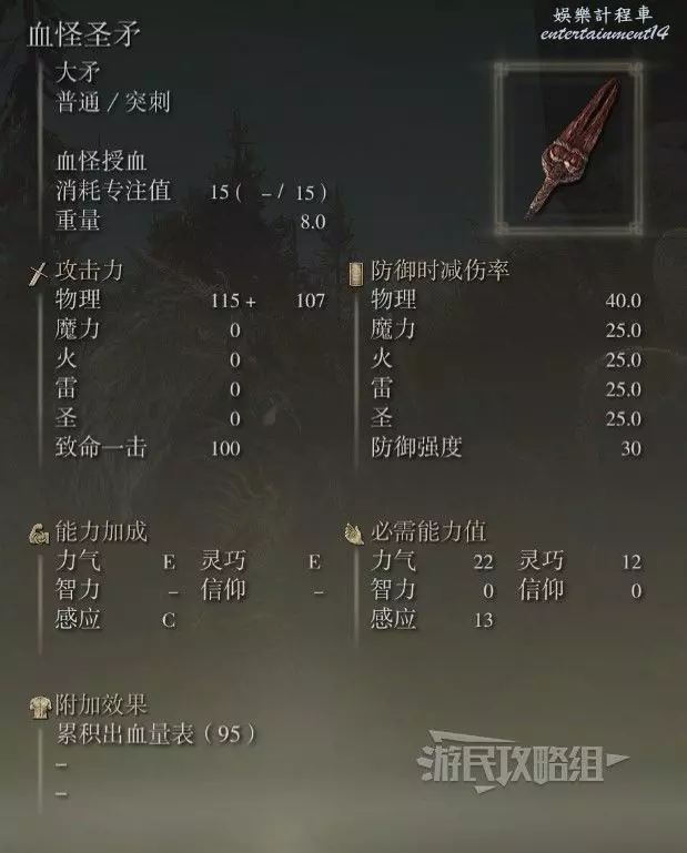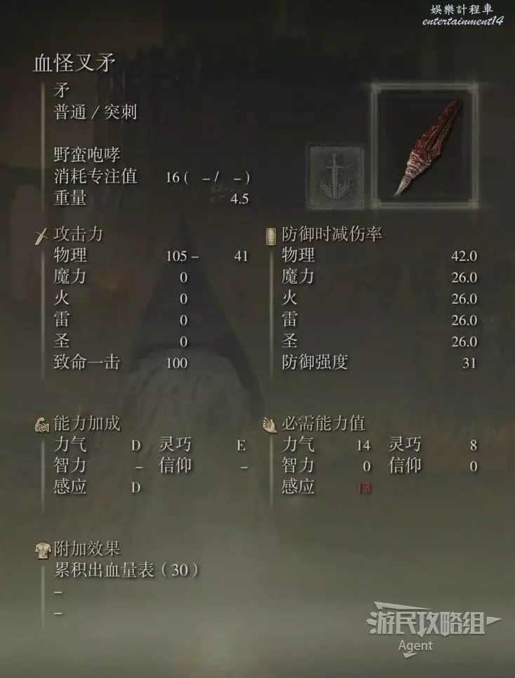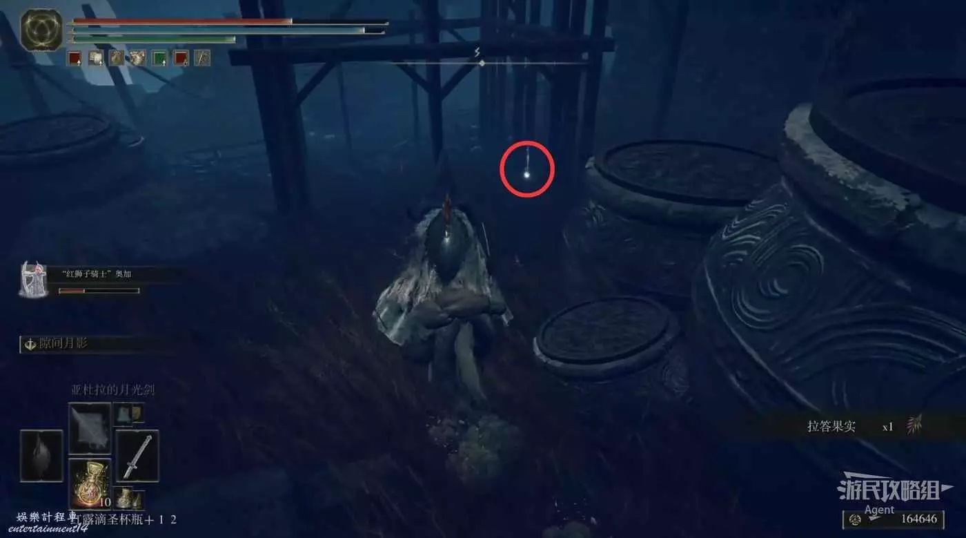 在勞弗古遺跡的“古遺跡下方”賜福點北面,在下圖位置的水池裡刷怪物,概率掉落【武器】血怪聖矛。